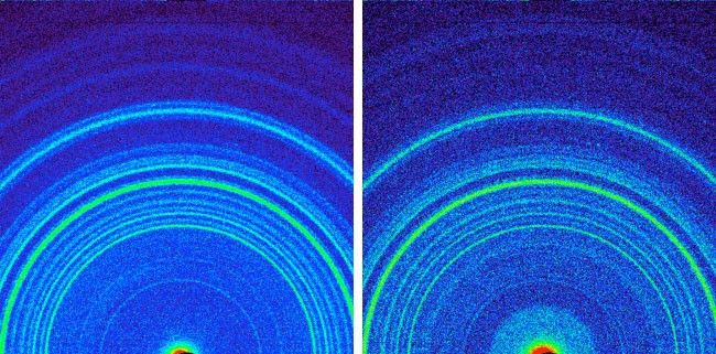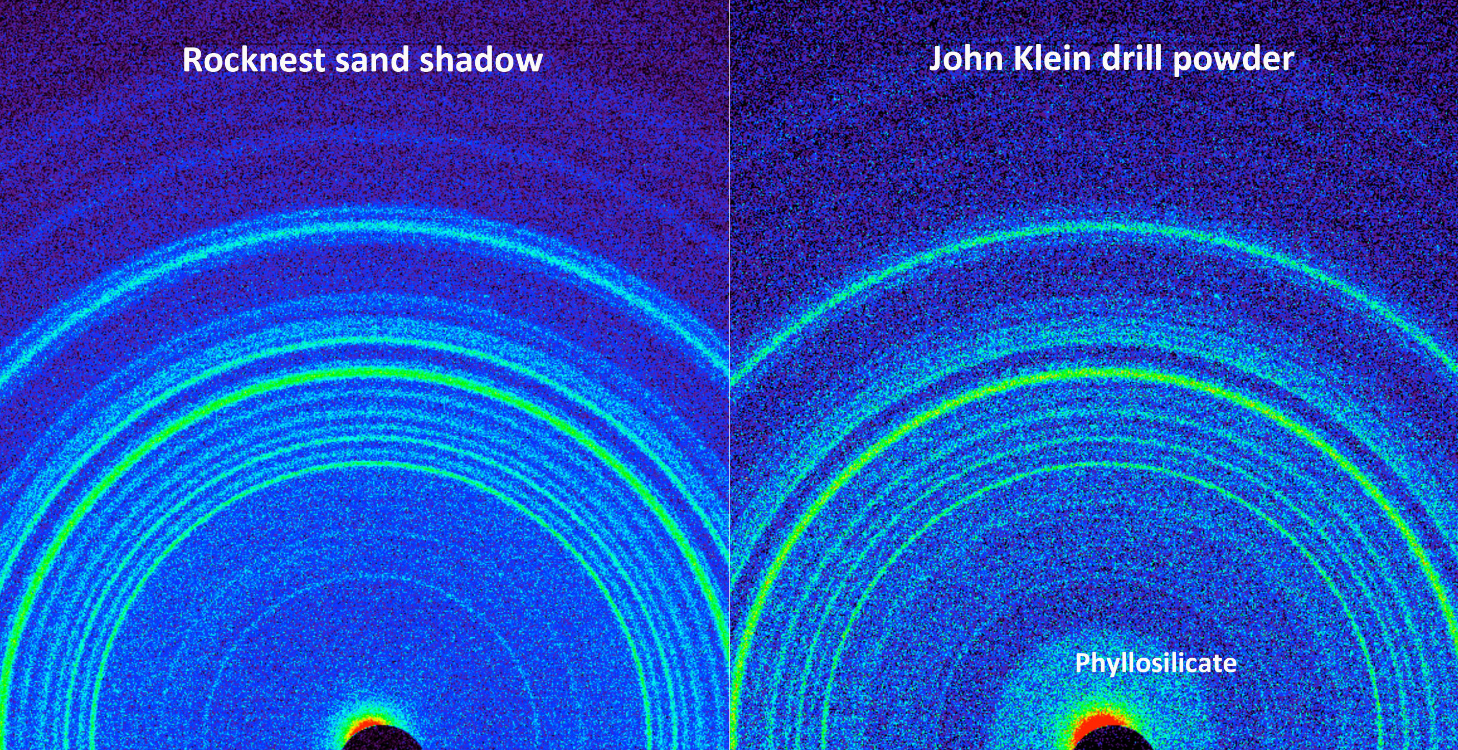 This side-by-side comparison shows the X-ray diffraction patterns of two different samples collected from the Martian surface by NASA's Curiosity rover. These images, made from data obtained by Curiosity's Chemistry and Mineralogy instrument (CheMin), show the patterns obtained from a drift of windblown dust and sand called "Rocknest" and from a powdered rock sample drilled from the "John Klein" bedrock.