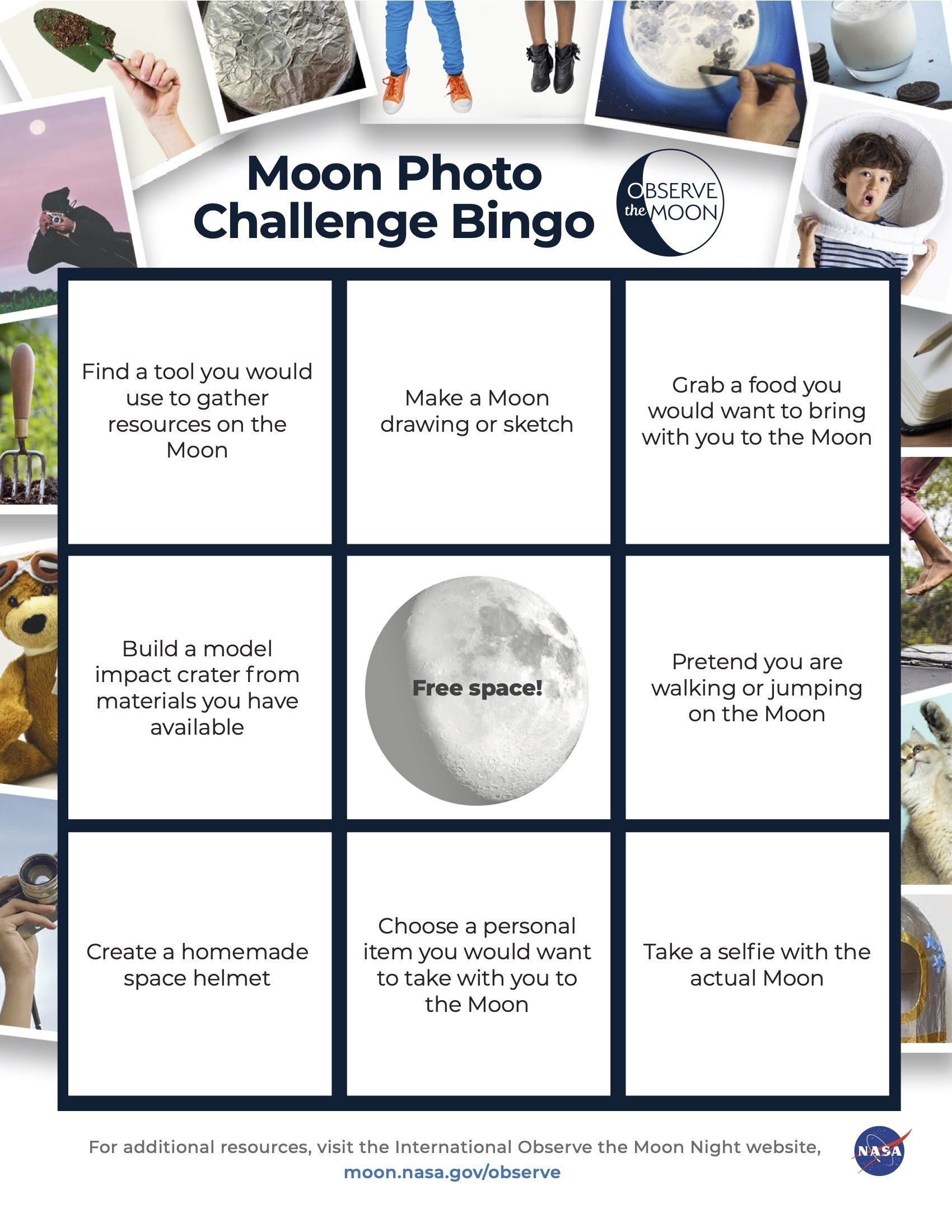 Channel your inner astronaut! Take a picture of yourself completing each of the Moon challenges from the sheet provided here.