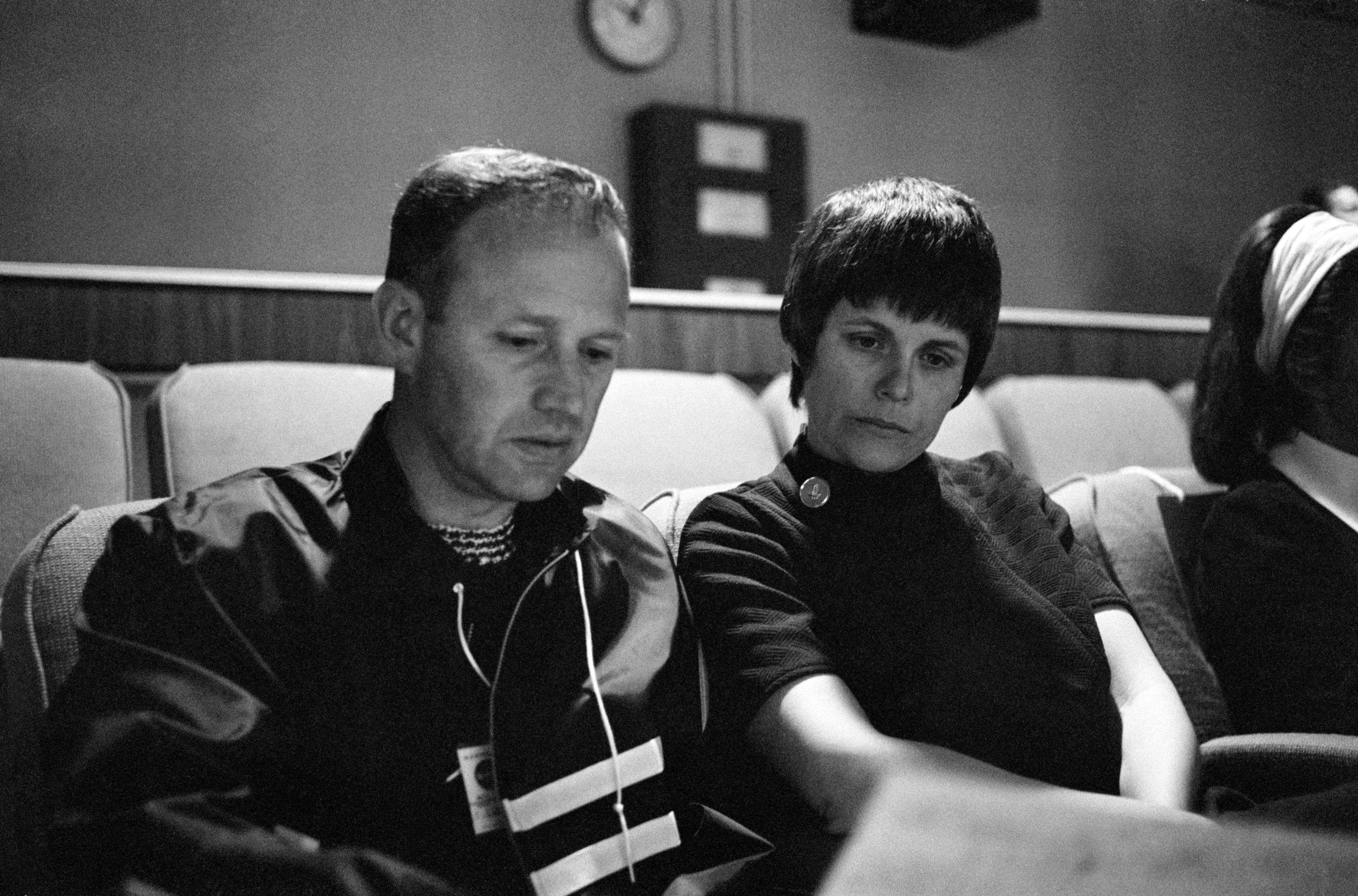 Mrs. Mary Haise receives an explanation of the revised flight plan of the Apollo 13 mission from astronaut Gerald P. Carr in the viewing room of the Mission Control Center (MCC), Building 30, at the Manned Spacecraft Center (MSC). Her husband, astronaut Fred W. Haise Jr., lunar module pilot for the Apollo 13 mission, was joining fellow crew members, astronauts James A. Lovell Jr., and John L. Swigert Jr. in making correction in their spacecraft following discovery of an oxygen cell failure several hours earlier.