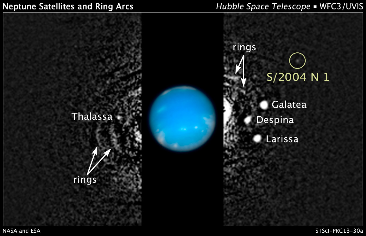 The moon is so small (no more than 12 miles across) and dim, it was missed by NASA's Voyager 2 spacecraft cameras when the probe flew by Neptune in 1989. Several other moons that were discovered by Voyager appear in this 2009 image, along with a circumplanetary structure known as ring arcs.