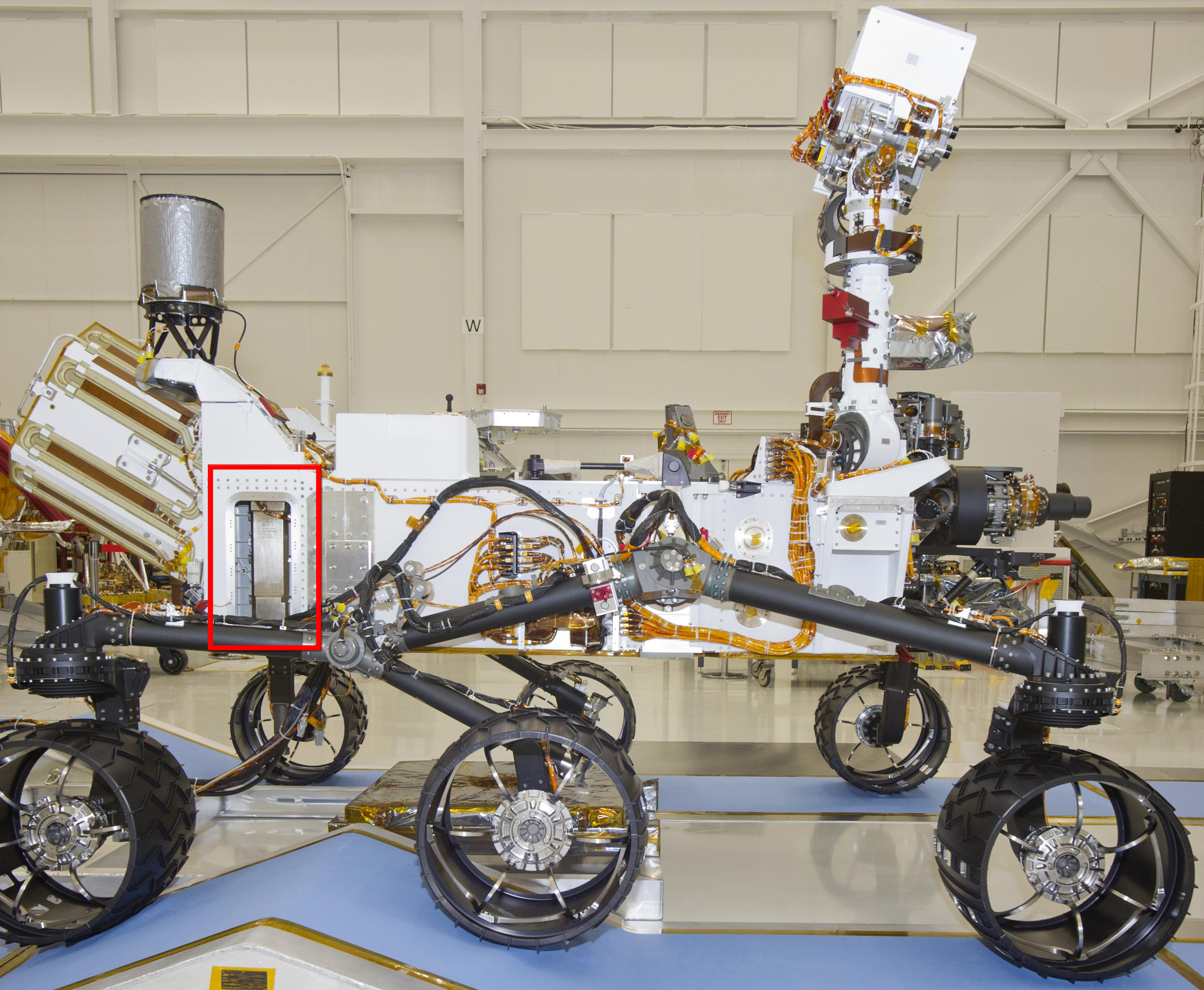The instrument, named Dynamic Albedo of Neutrons, or DAN, has two major components: the pulsed neutron generator on the starboard side of the rover (location indicated by red outline), and the detector and electronics module on the port side. The pulsed neutron generator will shoot high-energy neutrons into the ground. If there is hydrogen in the shallow subsurface, the injected neutrons will bounce off the hydrogen atoms with a characteristic decrease in energy. Two detection devices in the detector and electronics module measure the rate and delay time of the reflected neutrons, yielding information about the amount and depth of any hydrogen. At the mission's near-equatorial landing area and in the oxidizing environment near the Martian surface, most hydrogen is expected to be in the form of water molecules or water-derived hydroxyl ions bound to minerals.