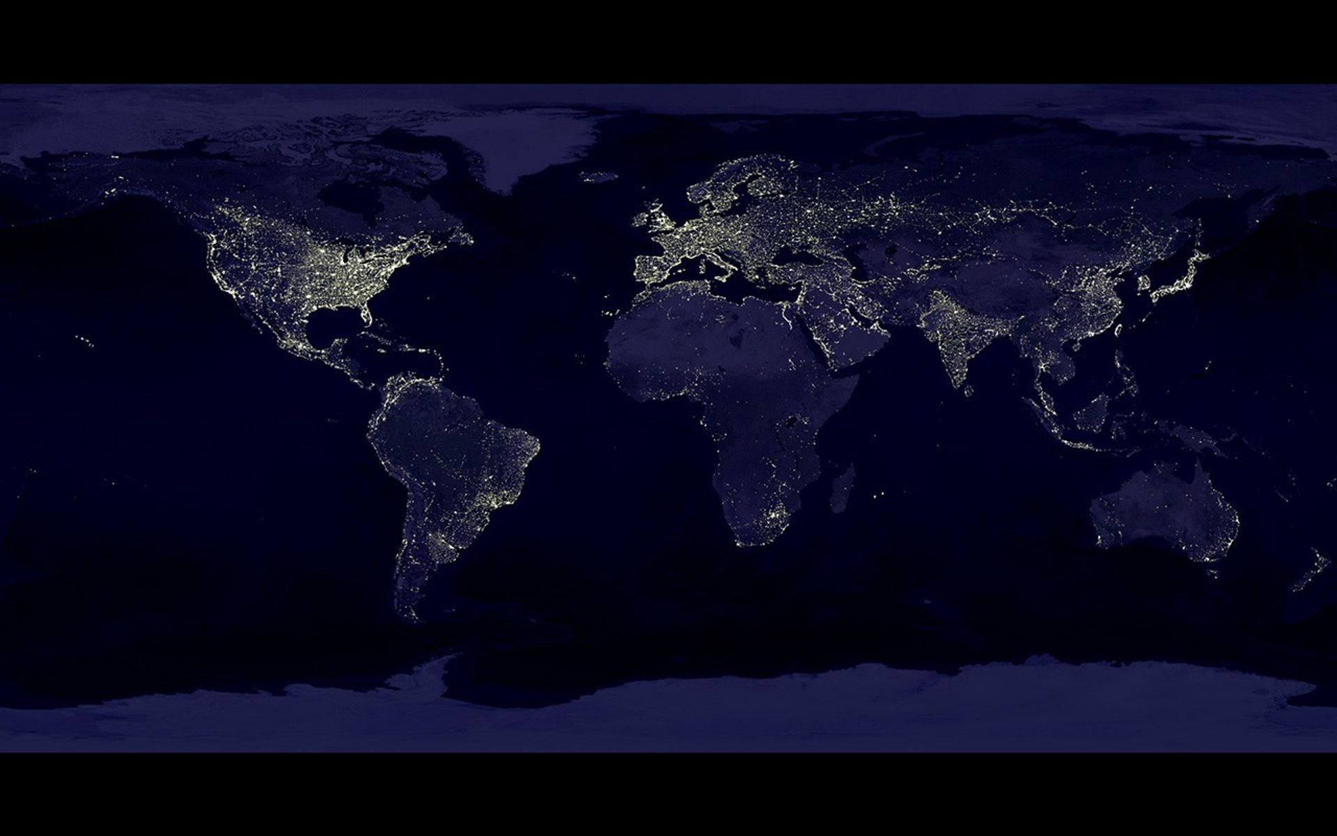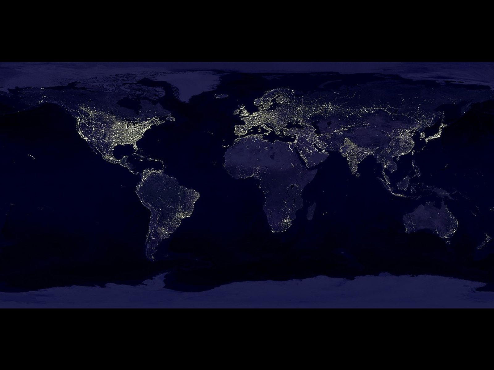 Earth's city lights as seen from space. The brightest areas of the Earth are the most urbanized, but not necessarily the most populated. More than a century after the invention of the electric light, many parts of the planet remain thinly populated and unlit. Image created with data from the Defense Meteorological Satellite Program Operational Linescan System.