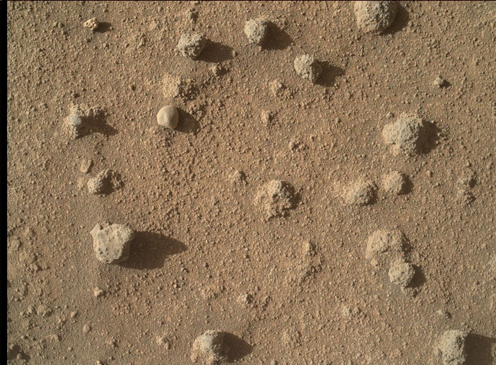 The nodules are about the size of garbanzo beans. Researchers are using Curiosity to investigate what the composition and texture may disclose about an ancient wet environment in which fluids may have circulated through the rock and cemented these nodules together more strongly than the surrounding sandstone.