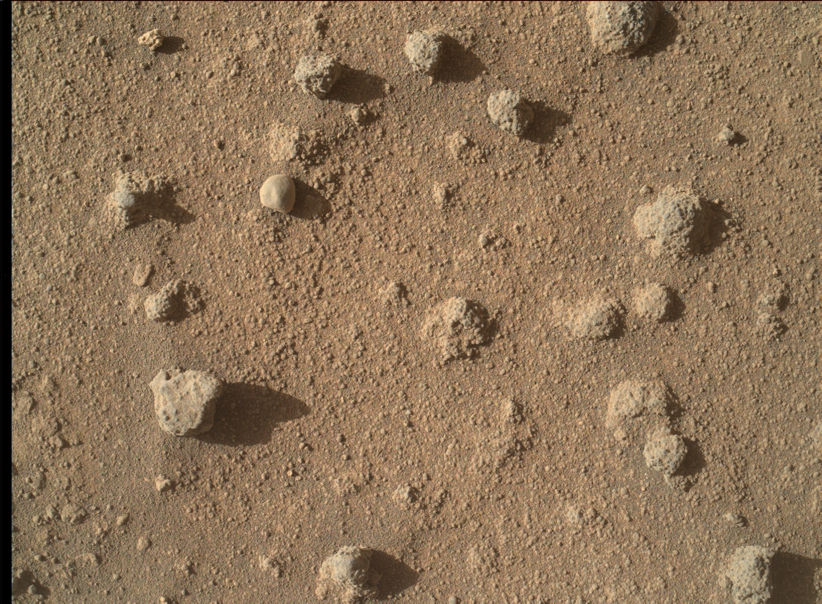 This view shows nodules exposed in sandstone that is part of the Stimson geological unit on Mount Sharp, Mars. The nodules can be seen to consist of grains of sand cemented together.