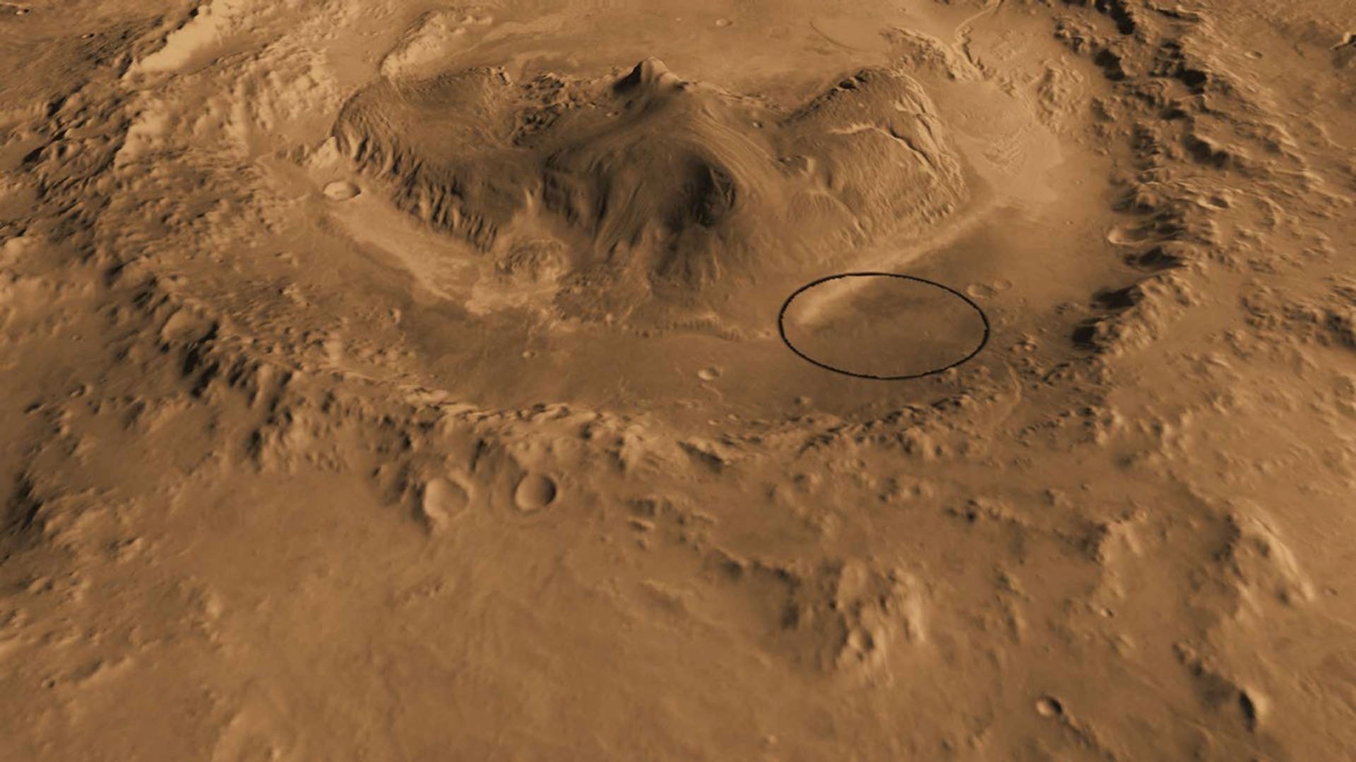 Gale crater is 96 miles (154 kilometers) in diameter and holds a layered mountain rising about 3 miles (5 kilometers) above the crater floor. The ellipse superimposed on this image indicates the candidate landing area, 12.4 miles (20 kilometers) by 15.5 miles (25 kilometers). The portion of the crater within the landing area has an alluvial fan likely formed by water-carried sediments. The lower layers of the nearby mountain -- within driving distance for Curiosity -- contain minerals indicating a wet history. The candidate landing site is at 4.5 degrees south latitude, 137.4 degrees east longitude.