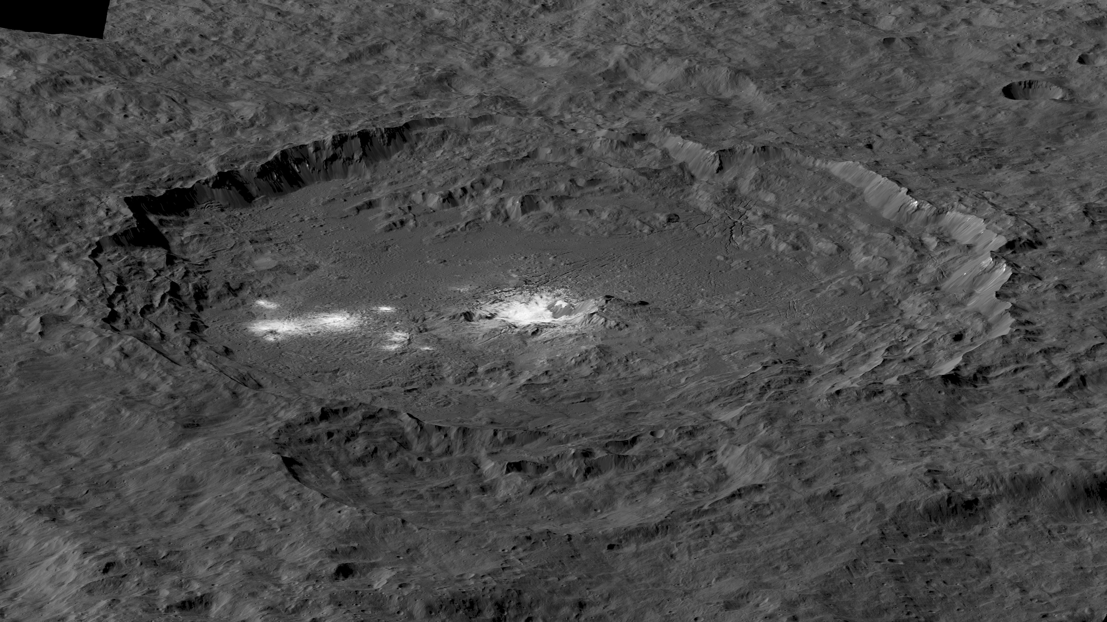 This simulated perspective view shows Occator Crater, measuring 57 miles (92 kilometers) across and 2.5 miles (4 kilometers) deep, which contains the brightest area on Ceres. This region has been the subject of intense interest since Dawn's approach to the dwarf planet in early 2015.