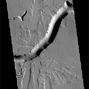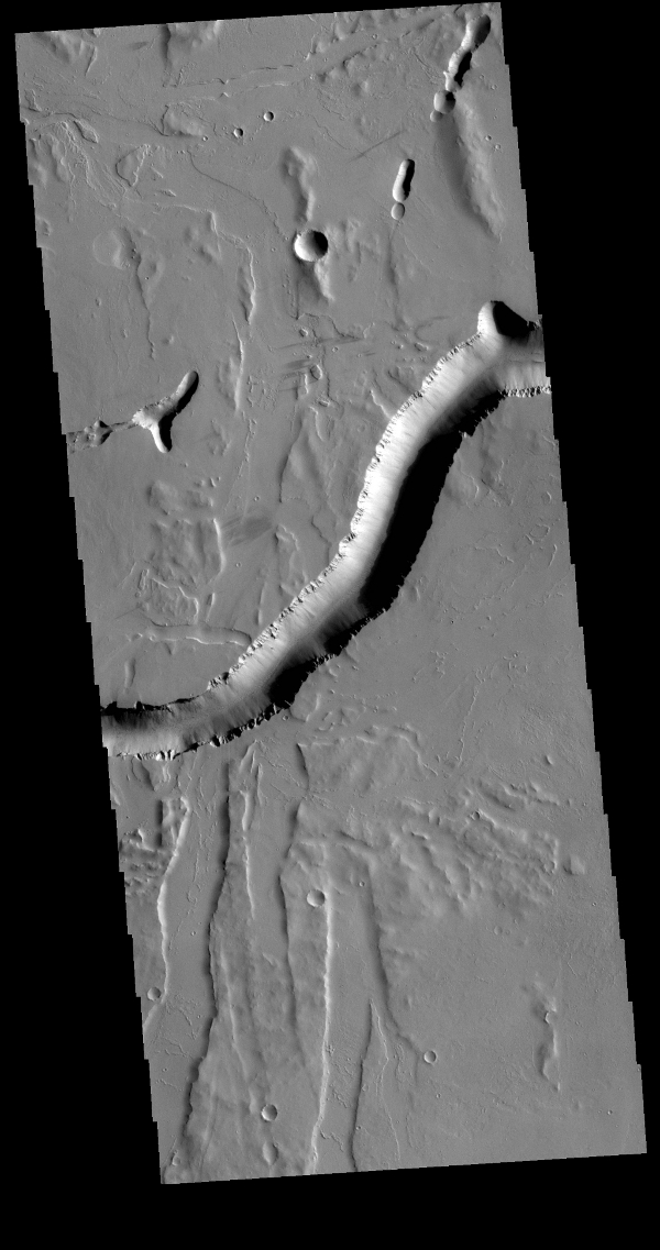 Olympica Fossae is a complex channel located on the volcanic plains between Alba Mons and Olympus Mons. The sinuosity of the large channel in the middle of the image indicates that this is a channel created by liquid flow. In this case the location and other surface features point to lava rather than water as the liquid. The more linear depressions at the bottom third of the image are possibly tectonic features called graben and formed by movement along fault lines. The Alba Mons region contains extensive faulting which formed due to collapse of the volcano.