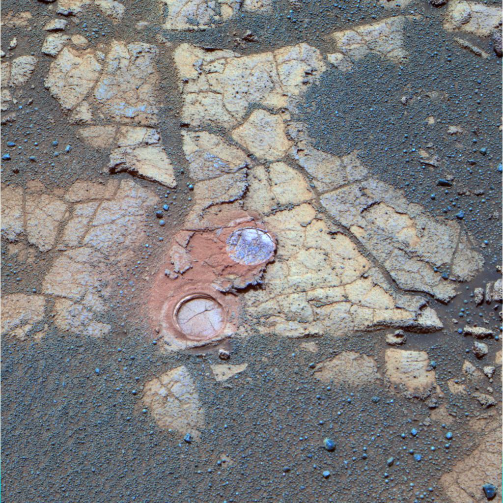 This false-color panoramic image, taken on martian day, or sol, 561 (Aug. 22, 2005) by the Opportunity rover, shows the nature of the outcrop rocks that the rover is encountering on its southward journey across the martian plains to "Erebus Crater." The rocks, similar in make-up to those encountered earlier in the mission, display a clear pattern of cracks as well as rind-like features (identifiable as a light shade of blue to olive in the image) coating the outcrop surface. Prominent in the image are two holes (one on the rock, one on the rind) drilled with the rover's rock abrasion tool to facilitate chemical analysis of the underlying material. The reddish color around the holes is from iron-rich dust produced during the grinding operation. The rind, nicknamed "Lemon Rind," and the underlying rock, nicknamed "Strawberry," have turned out to be similar in overall chemistry and texture. Science team members are working to understand the nature of the relationship between these kinds of rocks and rinds on the Meridiani plains. This false-color composite was generated from a combination of 750-, 530-, and 430-nanometer filter images taken by the Opportunity panoramic camera, an instrument that has acquired more than 36,000 color filter images to date of martian terrain at Meridiani Planum.
