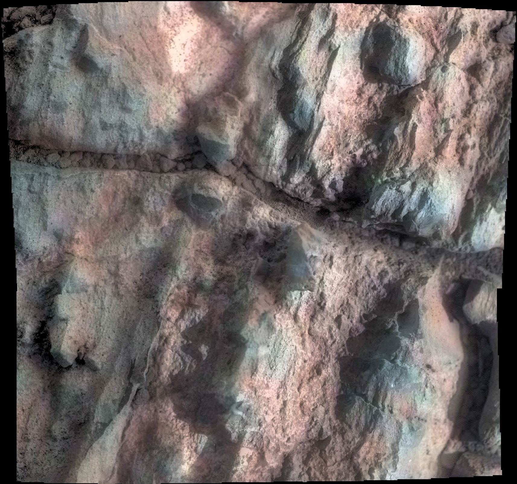 This mosaic combines four frames taken by the microscopic imager on Opportunity's robotic arm on Oct. 2, 2016, during the 4,512st Martian day, or sol, of the rover's work on Mars. Enhanced color information from Opportunity's panoramic camera has been added to emphasize differences in the materials visible in the target. Figure A is a version with no color information added to the microscopic imager mosaic.