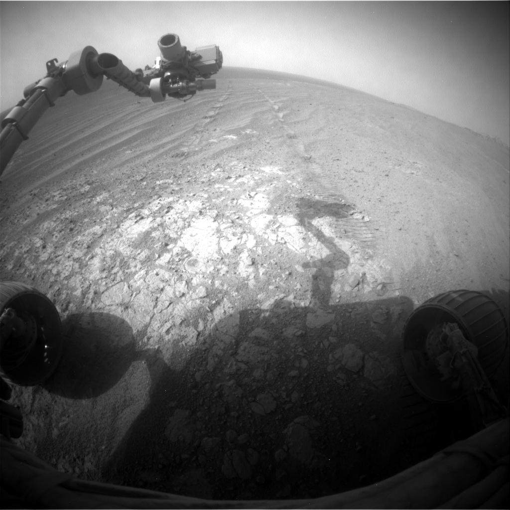 The scene includes Opportunity's robotic arm, called the "instrument deployment device," at upper left. Portions of the pale bedrock exposed on the ground in front of the rover are within the arm's reach. Researchers used instruments on the arm to examine a target called "Calera" on this patch of bedrock. The wheel tracks in the scene are from the drive -- in reverse -- to this location, a drive of 32.5 feet (9.9 meters) on Sol 3846 (Nov. 18, 2014).