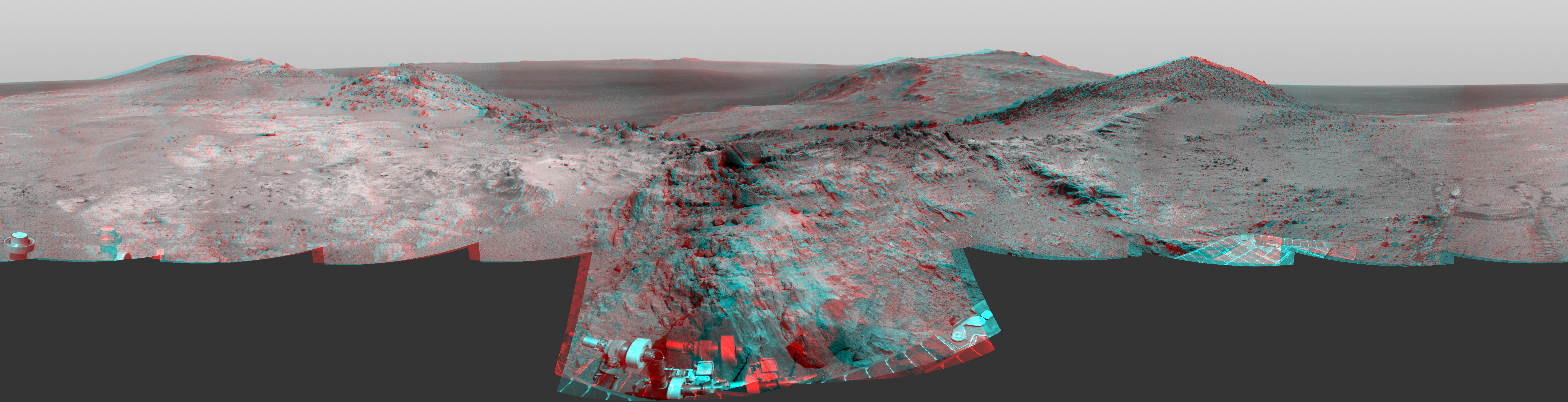 Cumulative driving by NASA's Mars Exploration Rover Opportunity surpassed marathon distance on March 24, 2015, as the rover neared a destination called "Marathon Valley," which is middle ground of this stereo view from early March. The scene appears three-dimensional when viewed through blue-red glasses with the red lens on the left.