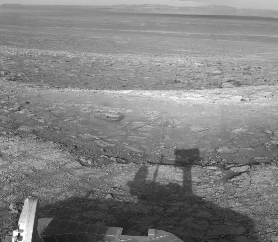 NASA's Mars Exploration Rover Opportunity used its navigation camera to record this vista looking eastward across Endeavour Crater, with the rover's own shadow in the foreground.