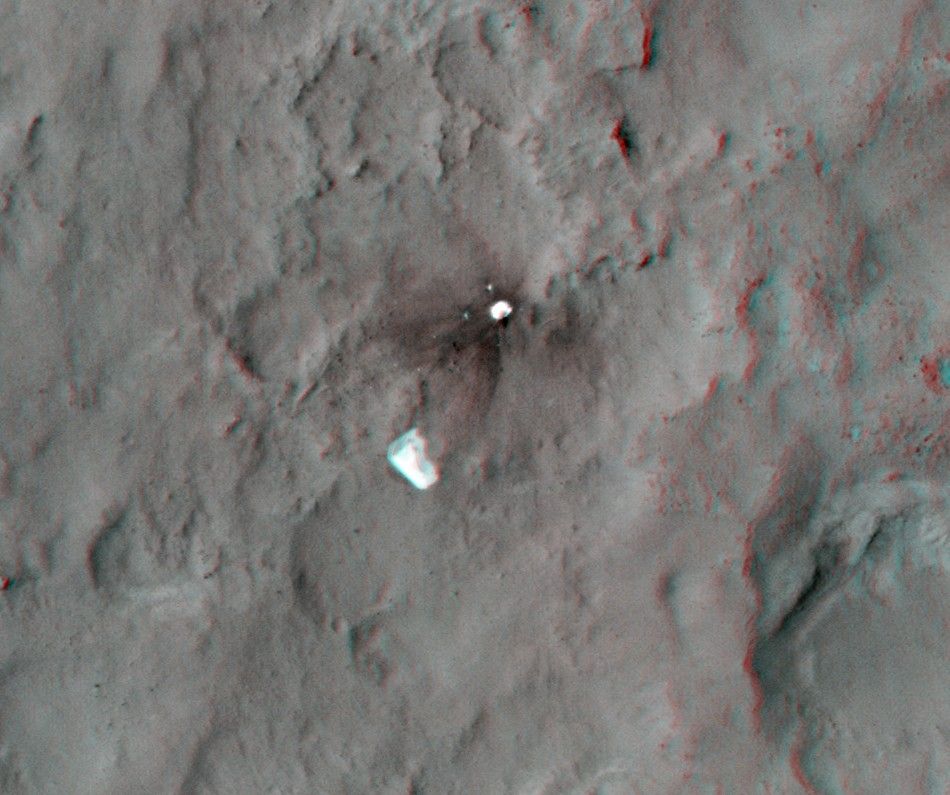 This 3D, or stereo anaglyph, view shows the parachute and back shell that helped guide NASA's Curiosity to the surface of Mars. The view was produced from images taken by the High Resolution Imaging Science Experiment (HiRISE) on NASA's Mars Reconnaissance Orbiter as the satellite flew overhead after landing.