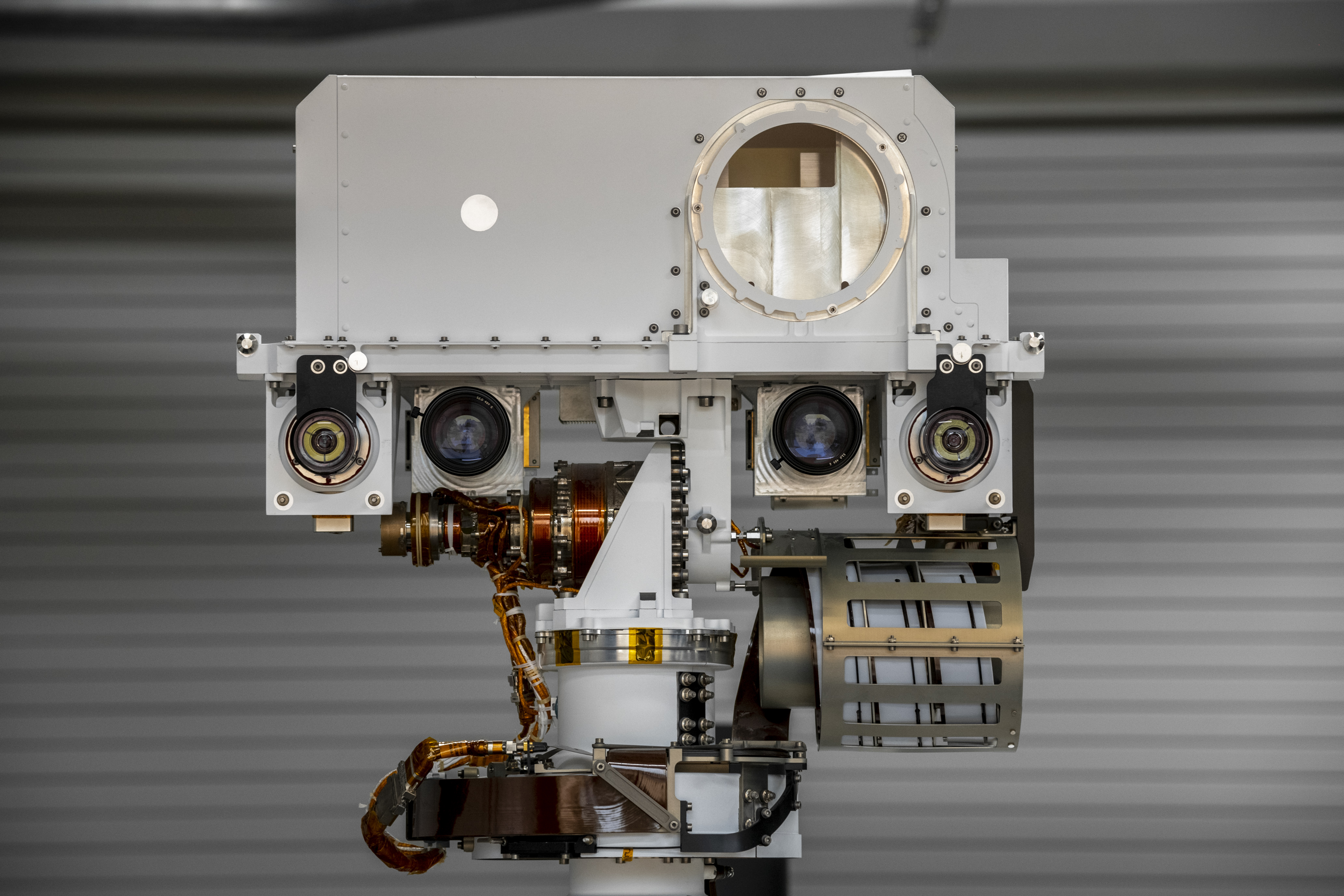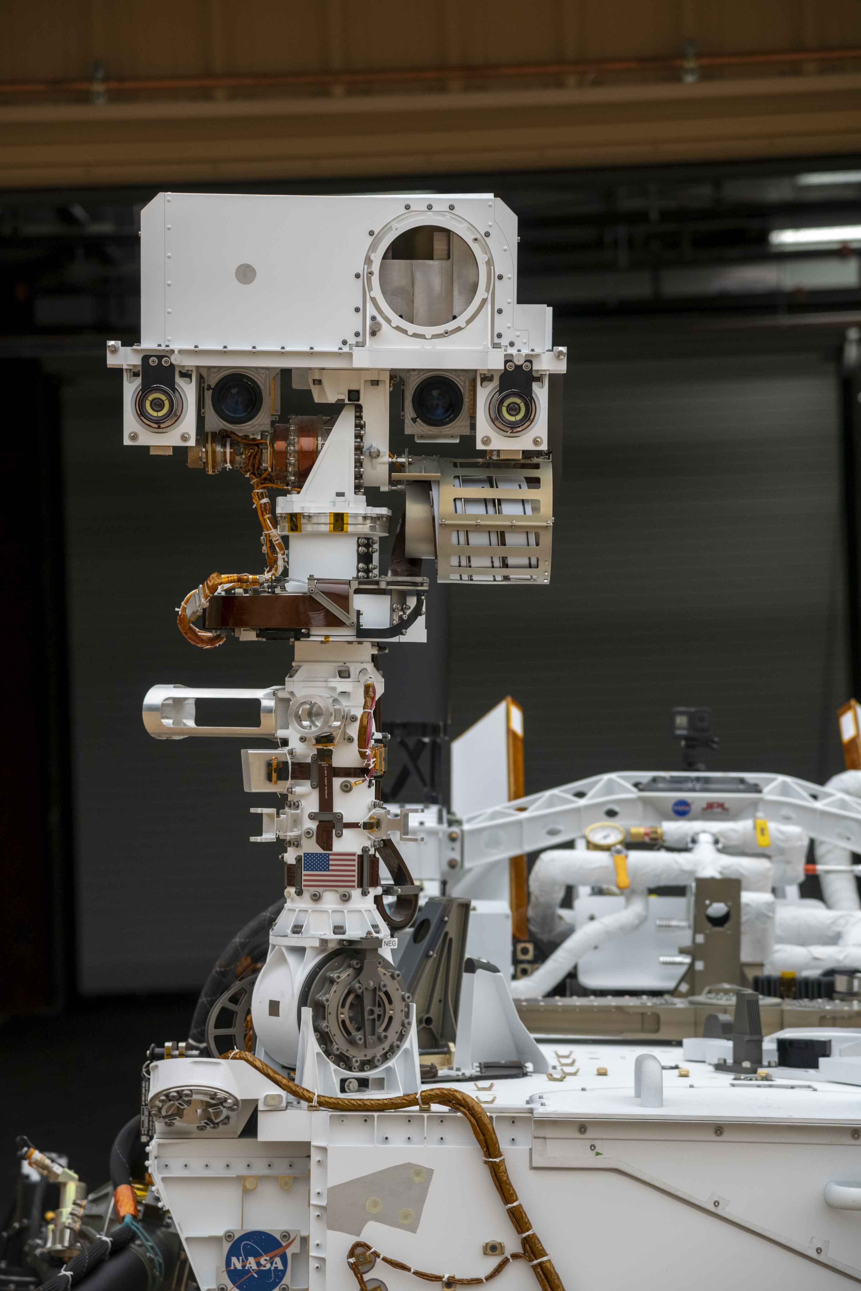 The mast hosts many of the rover’s cameras and scientific instruments. At the top of the mast, the large circular opening is where the SuperCam instrument will be installed on this test rover. Also visible in these images below the SuperCam “eye” are the navigation cameras (two cameras closest to the outside of the head) and the Mastcam-Z cameras inside of the navigation cameras.