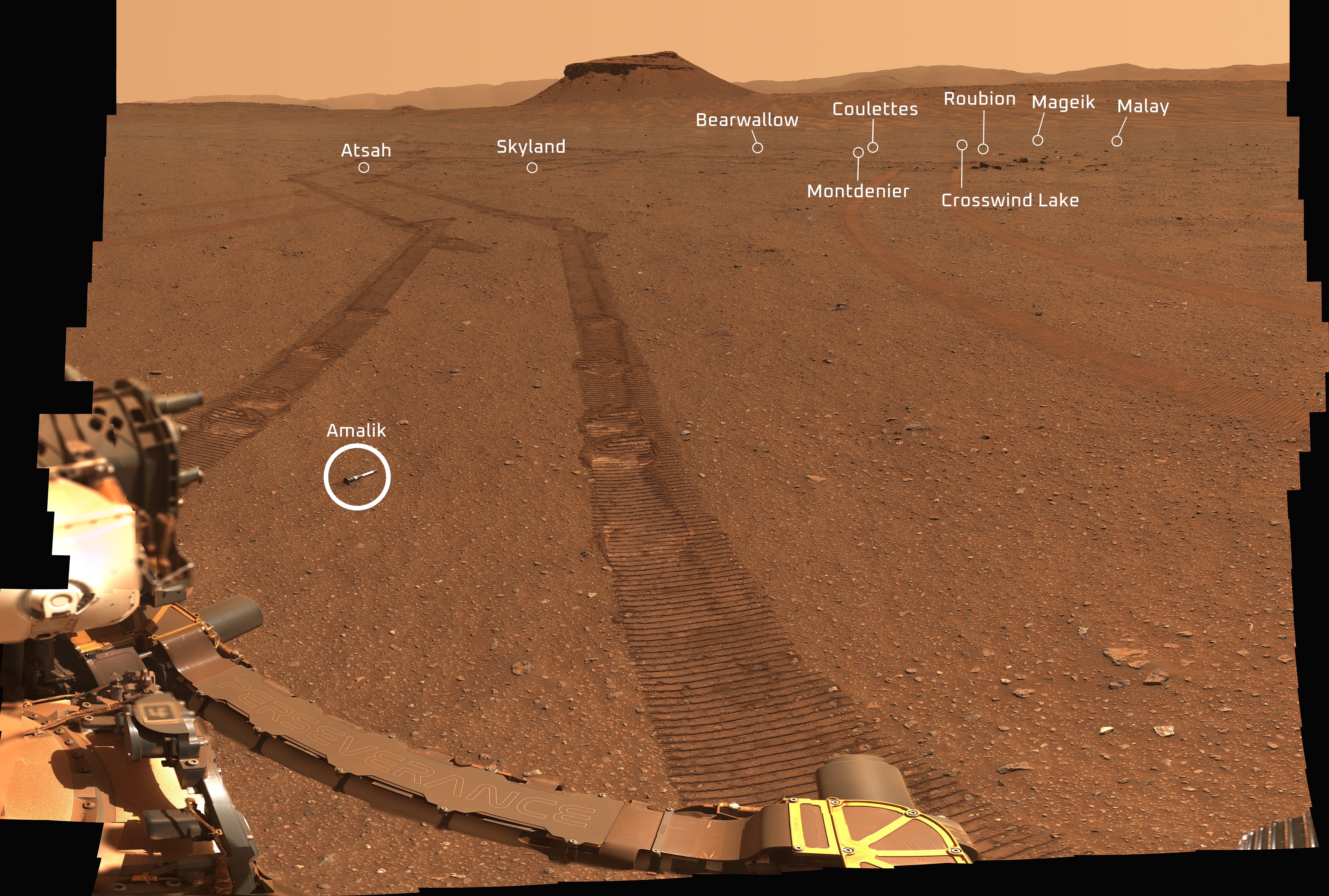 The “Amalik” sample closest to the rover was approximately 10 feet (3 meters) away from the camera at the time the image was taken. The “Atsah” and “Skyland” samples were approximately 66 feet (20 meters) away. “Bearwallow,” “Coulettes,” “Montdenier,” “Crosswind Lake,” and “Roubion” were approximately 115 to 164 feet (35 to 50 meters) away. “Mageik” and “Malay” were approximately 197 feet (60 meters) away.