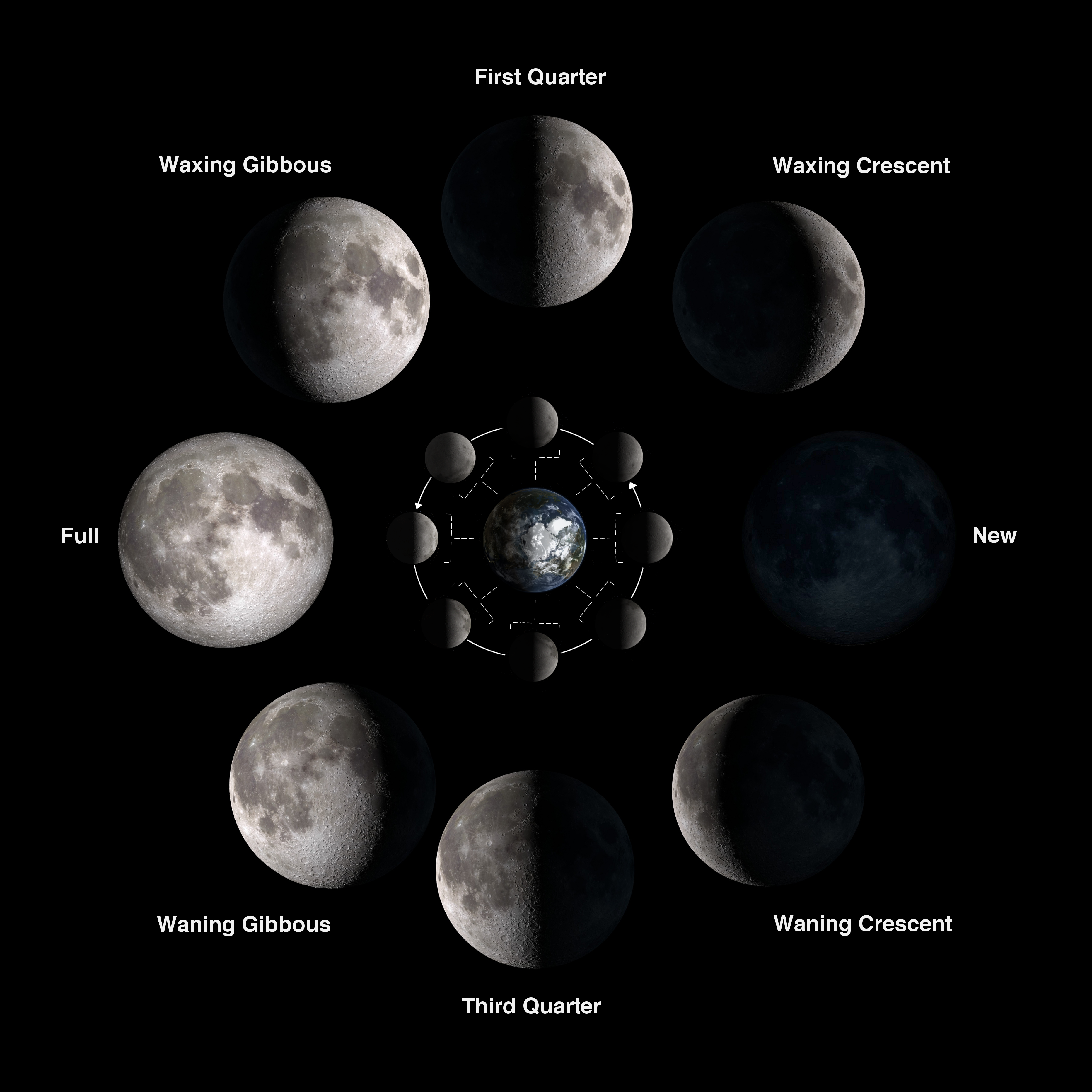 We always see the same side of the moon, because as the moon revolves around the Earth, the moon rotates so that the same side is always facing the Earth. But the moon still looks a little different every night. Sometimes the entire face glows brightly. Sometimes we can only see a thin crescent. Other times the moon seems to disappear entirely. As the bright parts of the moon appear to change shape during the month, each stage of the change is called a phase, and each phase carries its own name.