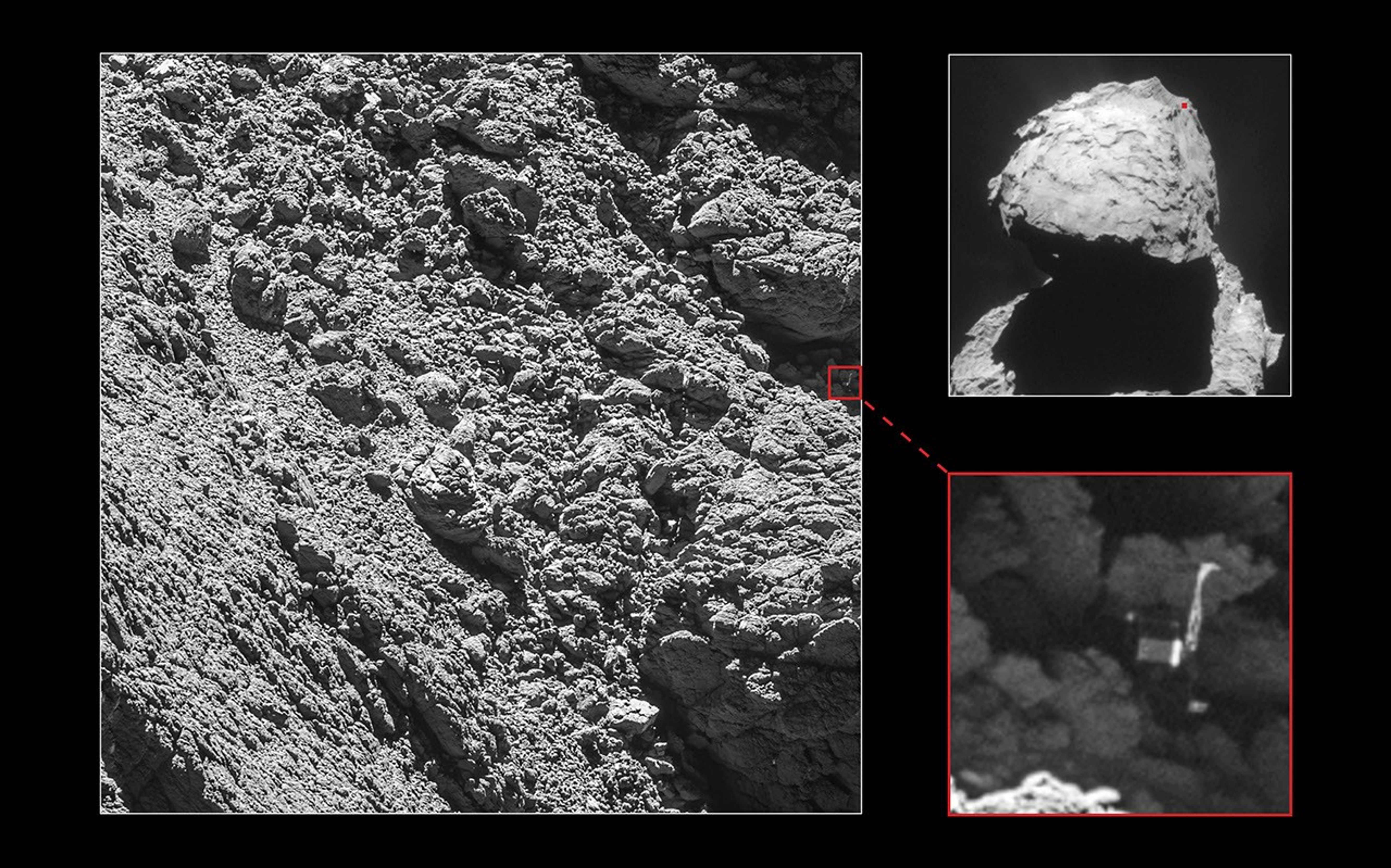 While most candidates could be discarded from analysis of the imagery and other techniques, evidence continued to build towards one particular target, which is now confirmed in images taken unprecedentedly close to the surface of the comet.