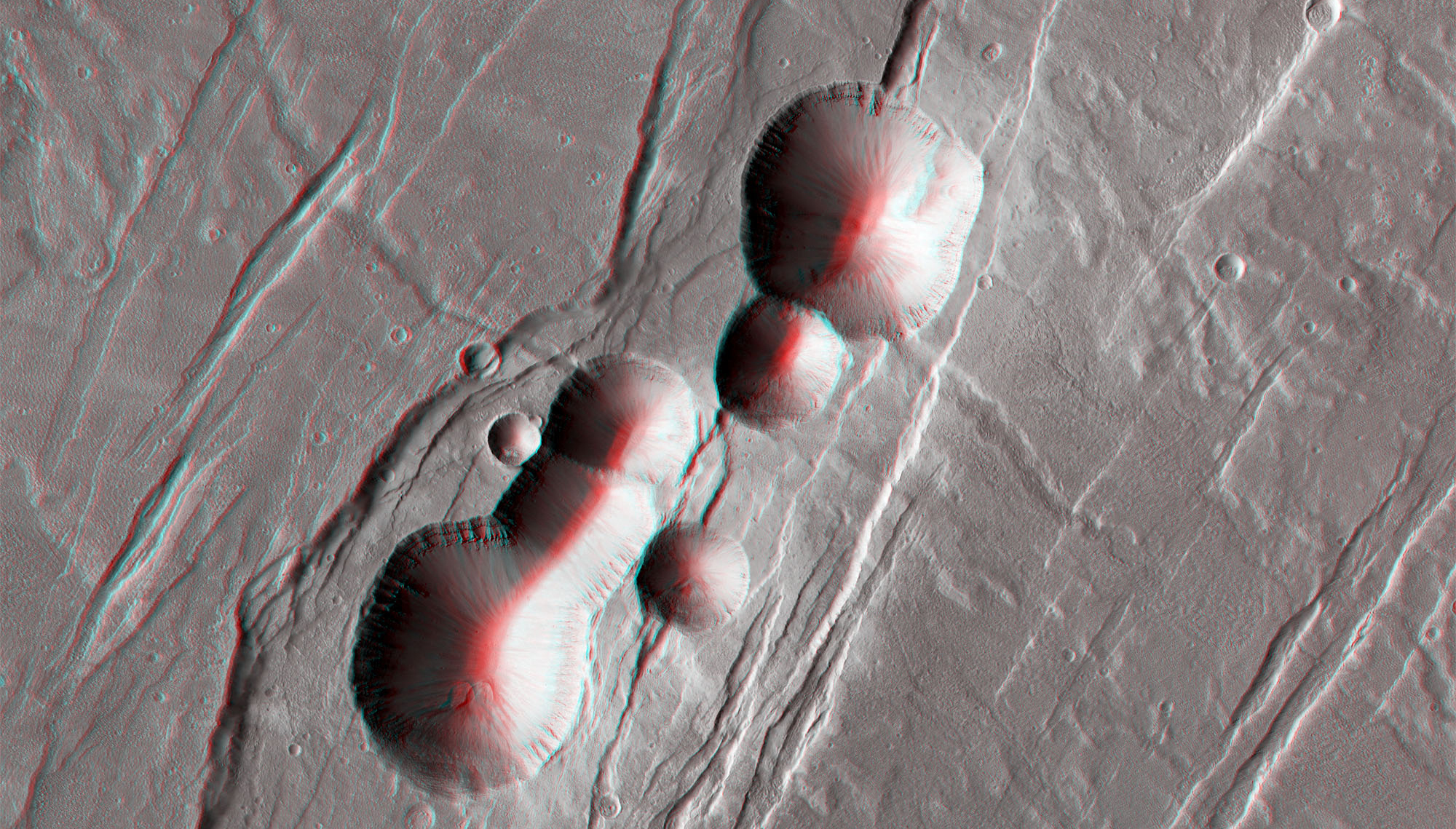 This chain of collapse pits located on the southeast flank of Alba Patera, a volcanic complex, probably formed when empty underground lava tubes collapsed.