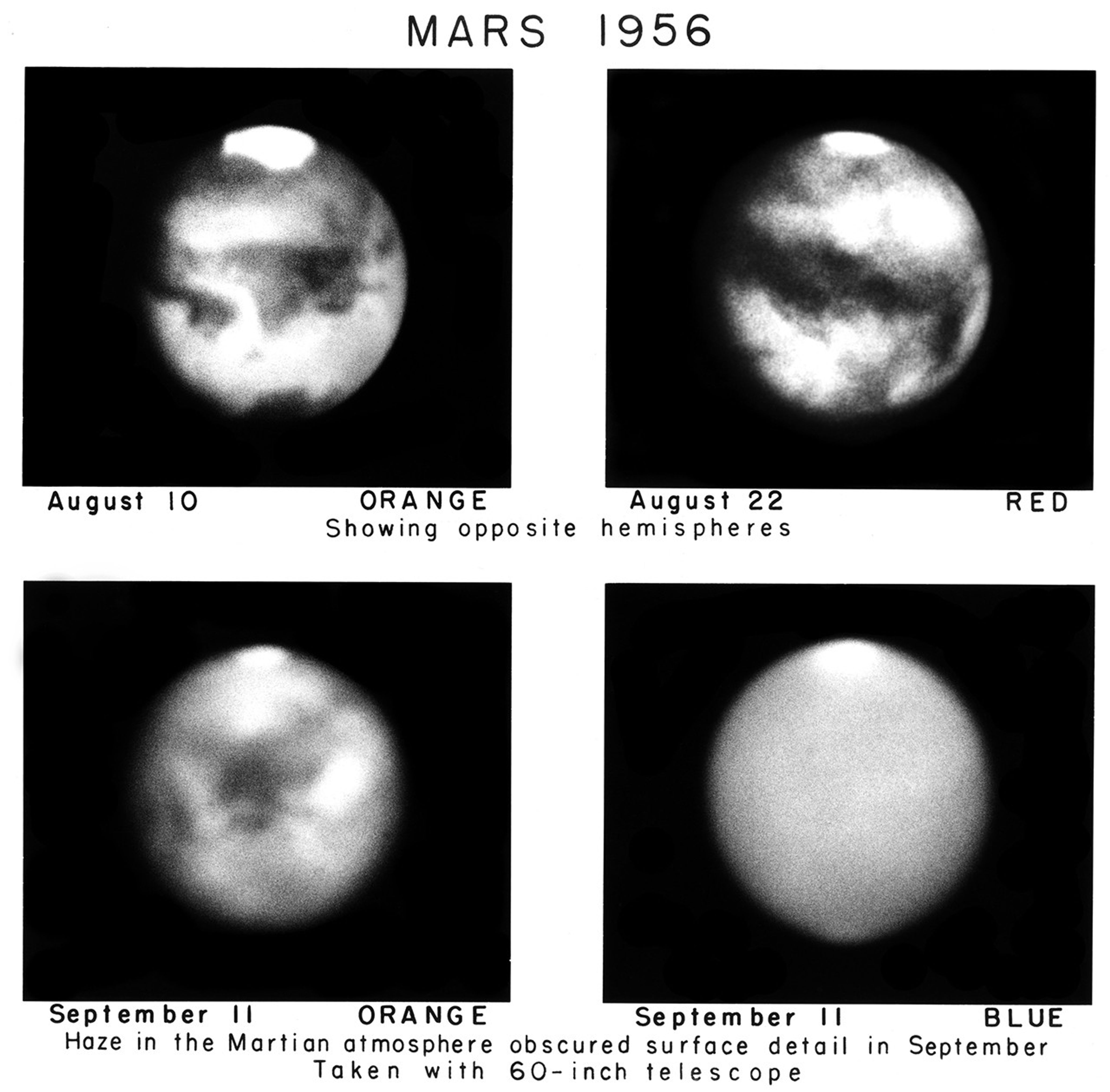 Astronomers took these four views of Mars during the Red Planet's closest approach to the Earth in 1956. They took a series of images through colored filters over the course of one month, to show a dynamic, changing surface.