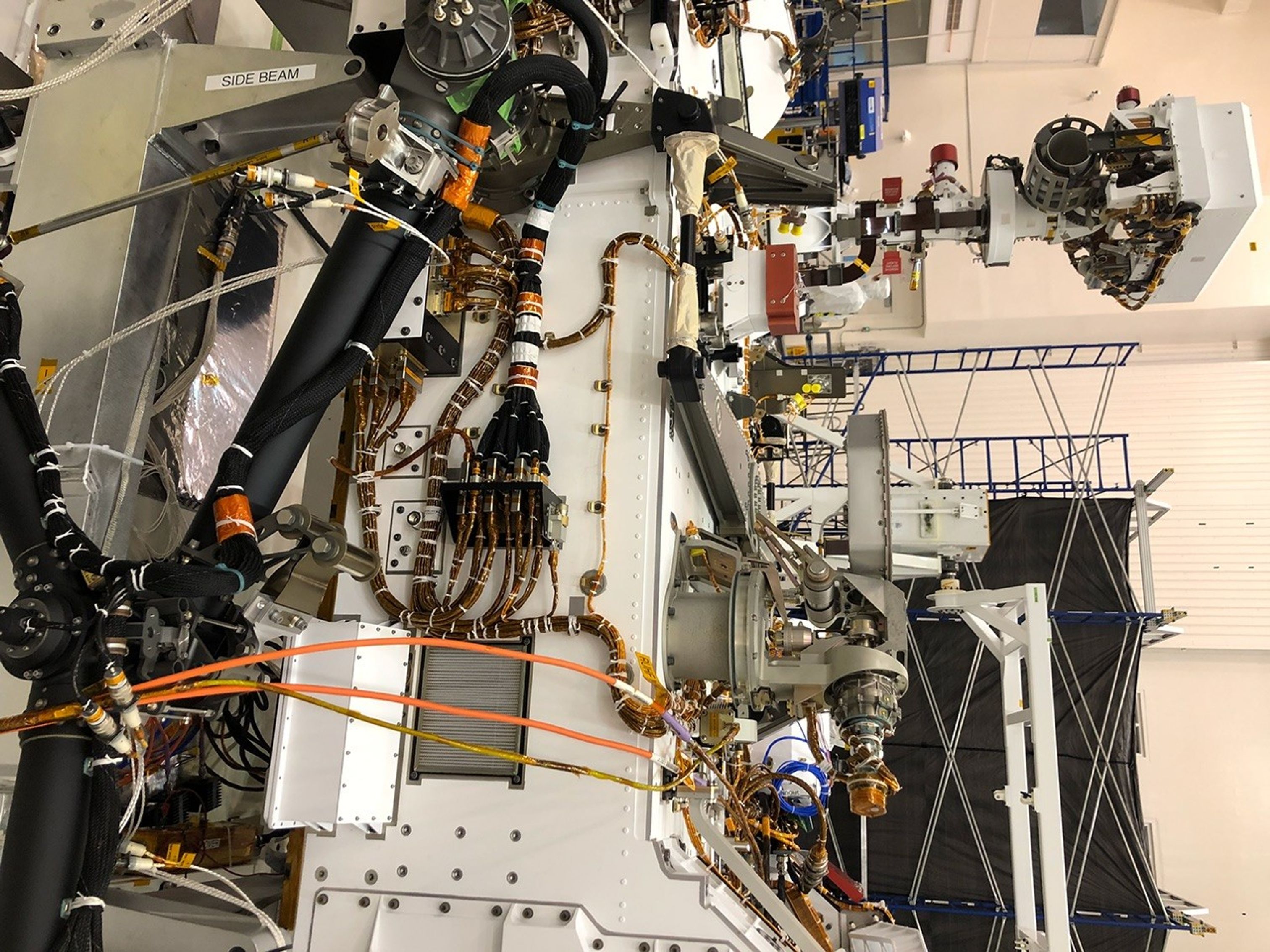 The port side of NASA's Perseverance Mars rover can be seen in this image taken on Nov. 16, 2019, in High Bay 1 of the Spacecraft Assembly Facility at NASA's Jet Propulsion Laboratory in Southern California. At the top left, the rover's remote sensing mast can be seen in the deployed position. To the right of the mast in the center of the image is the light gray high-gain antenna. At center of the image, attached to the side of the rover, is a black cable bracket (with gold cabling running through it). Attached to the top of this black bracket – and gray in color – is the Entry Descent and Landing (EDL) microphone. The rectangular screen to the right of the cable bracket is the rover chassis HEPA filter, which is above the white box housing the Mars Oxygen In-Situ Resource Utilization Experiment (MOXIE) inlet filter assembly. Gray and bright orange cables seen in the foreground of the image belong to ground support equipment.