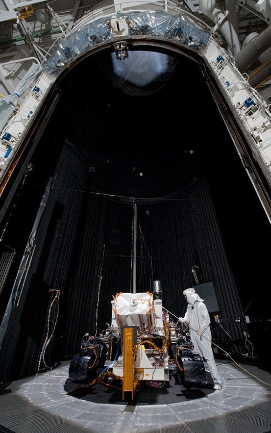 In this March 8, 2011, image, Curiosity is fully assembled with all primary flight hardware and instruments. The test chamber's door is still open. After the door is closed, a near-vacuum environment can be established, and the chamber walls flooded with liquid nitrogen for chilling to minus 130 degrees Celsius (minus 202 degrees Fahrenheit). A bank of powerful lamps simulates sunshine on Mars. The technician in the picture is using a wand to map the solar simulation intensities at different locations in the chamber just prior to the start of the testing.
