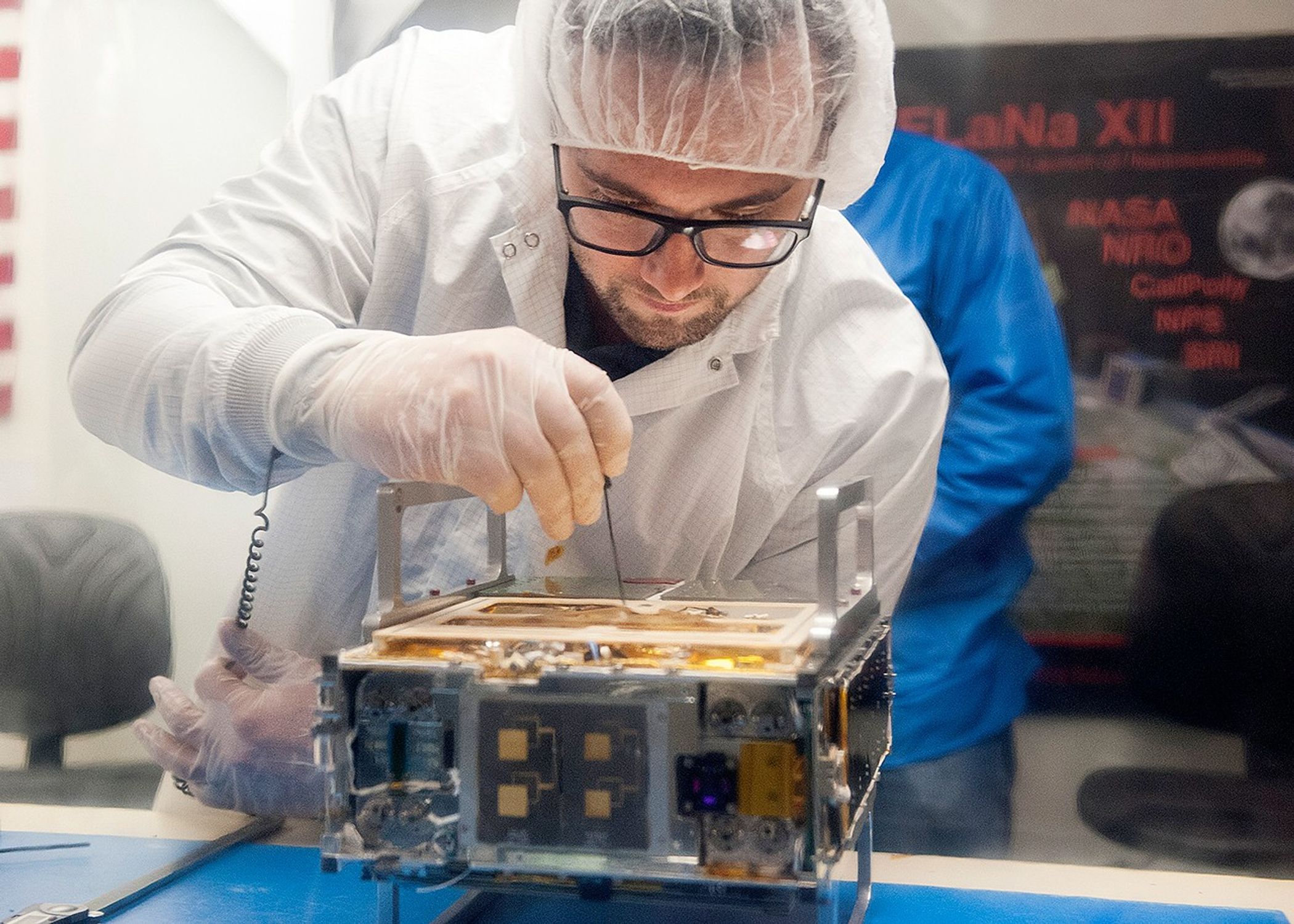Joel Steinkraus, MarCO lead mechanical engineer from JPL, makes an adjustment on the CubeSat prior to integration in a deployment box as seen inside the cleanroom lab at Cal Poly San Luis Obispo on Monday, March 12.