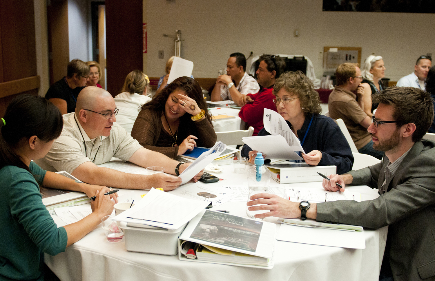 A group of teachers discusses solutions to a problem-solving activity at the Aug. 5, 2012, Curiosity Educator Workshop at NASA’s Jet Propulsion Laboratory in Pasadena, Calif.