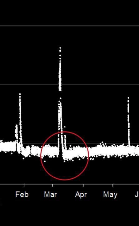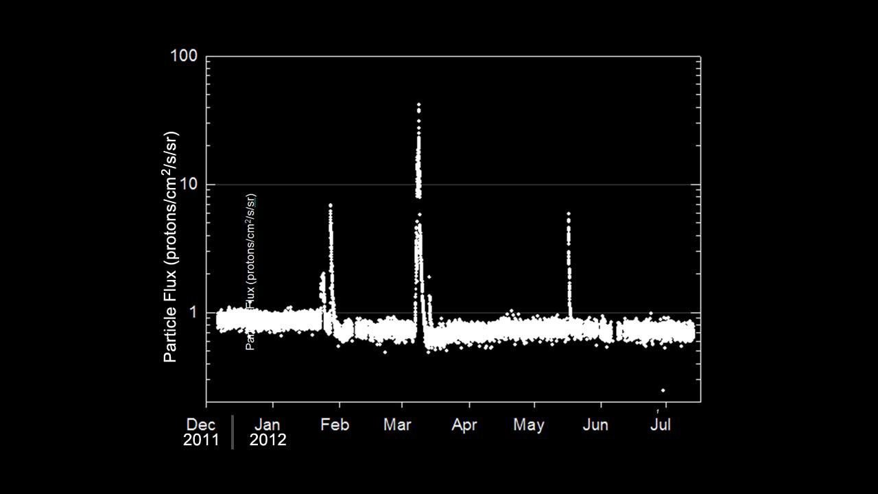 This graphic shows the flux of radiation detected by NASA's Mars Science Laboratory on the trip from Earth to Mars from December 2011 to July 2012. The spikes in radiation levels occurred in February, March and late May of 2012 because of large solar energetic particle events caused by giant flares on the sun.