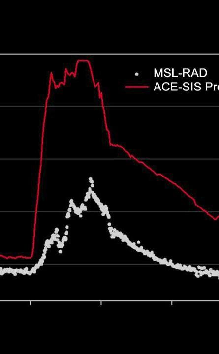 Zooming in on the solar energetic particle event in March, a red line shows the particle flux observed by the Solar Isotope Spectrometer instrument on NASA's Advanced Composition Explorer. ACE orbits the L1 libration point, which is a point of Earth-sun gravitational equilibrium about 930,000 miles (1.5 million kilometers) from Earth and 92.27 million miles (148.5 million kilometers) from the sun. In March, the ACE spacecraft was roughly aligned with MSL in terms of the path the solar particles took from the sun, thus providing a good estimate of the radiation levels outside of MSL's shielding. The measurements from the Solar Isotope Spectrometer are several orders of magnitude greater than those seen by MSL's Radiation Assessment Detector inside the capsule.