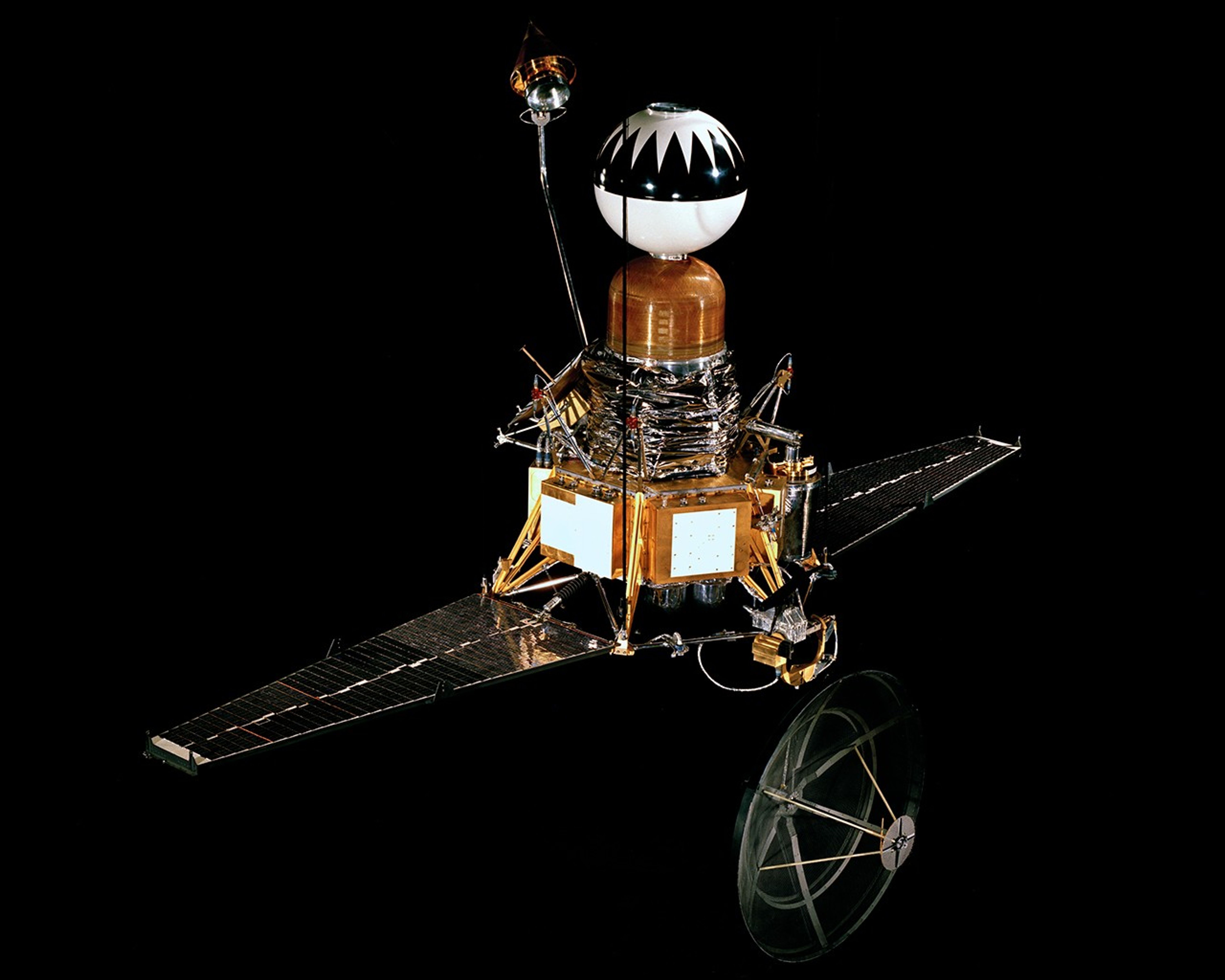 Photo of a scale model of a Ranger Block II spacecraft model. The design was used for Rangers 3, 4 and 5, three early NASA Moon missions of the 1960s.