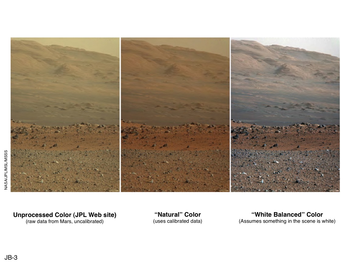 These three versions of the same image taken by the Mast Camera (Mastcam) on NASA's Mars rover Curiosity illustrate different choices that scientists can make in presenting the colors recorded by the camera. The left image is the raw, unprocessed color, as it is received directly from Mars (and as available on the MSL Raw Images Web site: http://mars.jpl.nasa.gov/msl/multimedia/raw/). The center rendering was produced after calibration of the image to show an estimate of "natural" color, or approximately what the colors would look like if we were to view the scene ourselves on Mars. The right image shows the result of then applying a processing method called white-balancing, which shows an estimate of the colors of the terrain as if illuminated under Earth-like, rather than Martian, lighting.