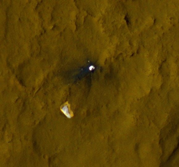 This color view of the parachute and back shell that helped deliver NASA's Curiosity rover to the surface of the Red Planet was taken by the High-Resolution Imaging Science Experiment (HiRISE) camera on NASA's Mars Reconnaissance Orbiter. The area where the back shell impacted the surface is darker because lighter-colored material on the surface was kicked up and displaced.