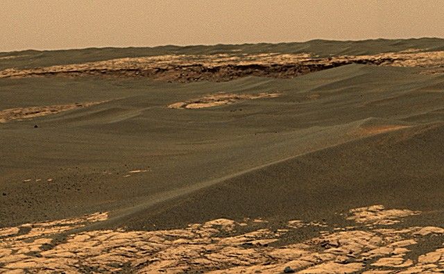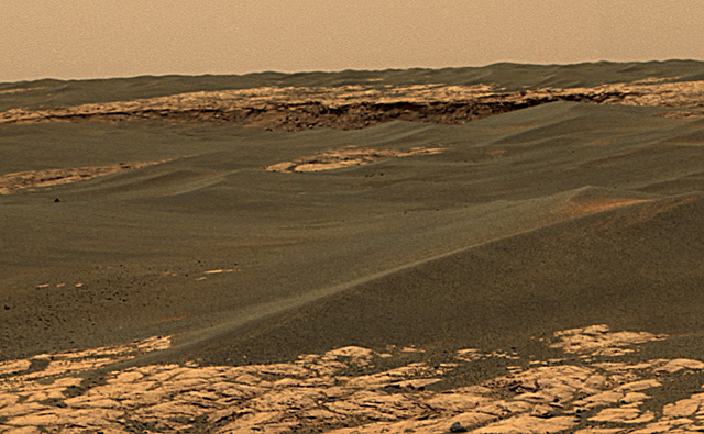 This image shows a portion of the rim of "Erebus Crater" in the Meridiani Planum region of Mars. This approximately true-color view from the panoramic camera on Opportunity is a composite of frames acquired on the rover's 657th Martian day, or sol. This is a small portion of a large panorama. Other portions of the panorama were still being shot three sols later.