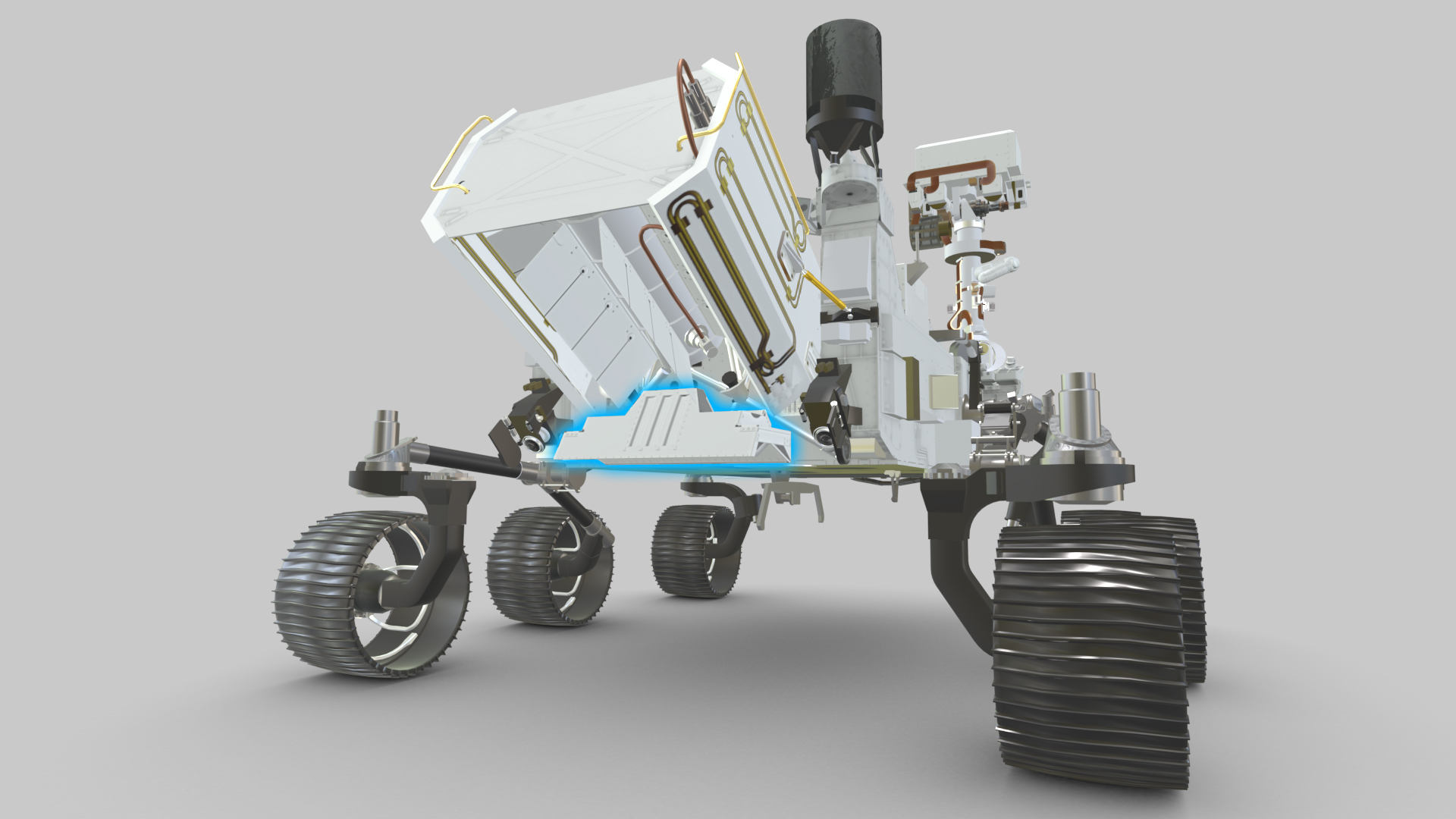 Perseverance's Radar Imager for Mars' Subsurface Experiment (RIMFAX) uses radar waves to probe the ground, revealing the unexplored world that lies beneath the Martian surface. Highlighted in blue in this visualization from the interactive tool Learn About Perseverance, the instrument's antenna is externally mounted underneath the Multi-Mission Radioisotope Thermoelectric Generator (MMRTG – the rover’s nuclear battery) on the back of the Perseverance.