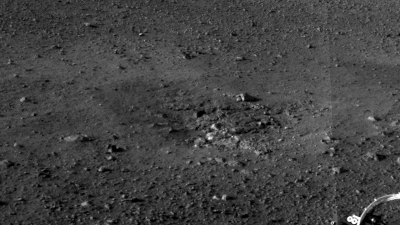 This is a close-up view of a zone where the soil at Curiosity's landing site was blown away by the thrusters on the rover's descent stage. The excavation of the soil reveals probable bedrock outcrop. This is important because it shows the shallow depth of the soil in this area. The area surrounding the zones of excavation shows abundant small rocks that may form a pavement-like layer above harder bedrock.