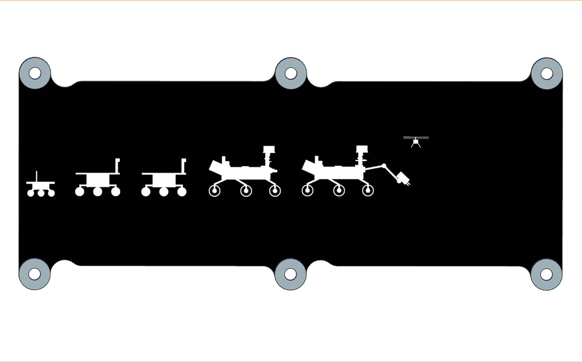 This artwork is etched onto a metal plate attached to the deck of the Mars Perseverance rover. The image depicts all of the rovers which have driven on Mars. On the far left is the Sojourner rover (1997), followed by twin rovers Spirit and Opportunity (2004), then Curiosity (2012), and Perseverance (2021). The rovers have gotten larger and more capable of exploring challenging terrain. Also pictured is Ingenuity, a helicopter which could demonstrate the first powered flight on Mars.