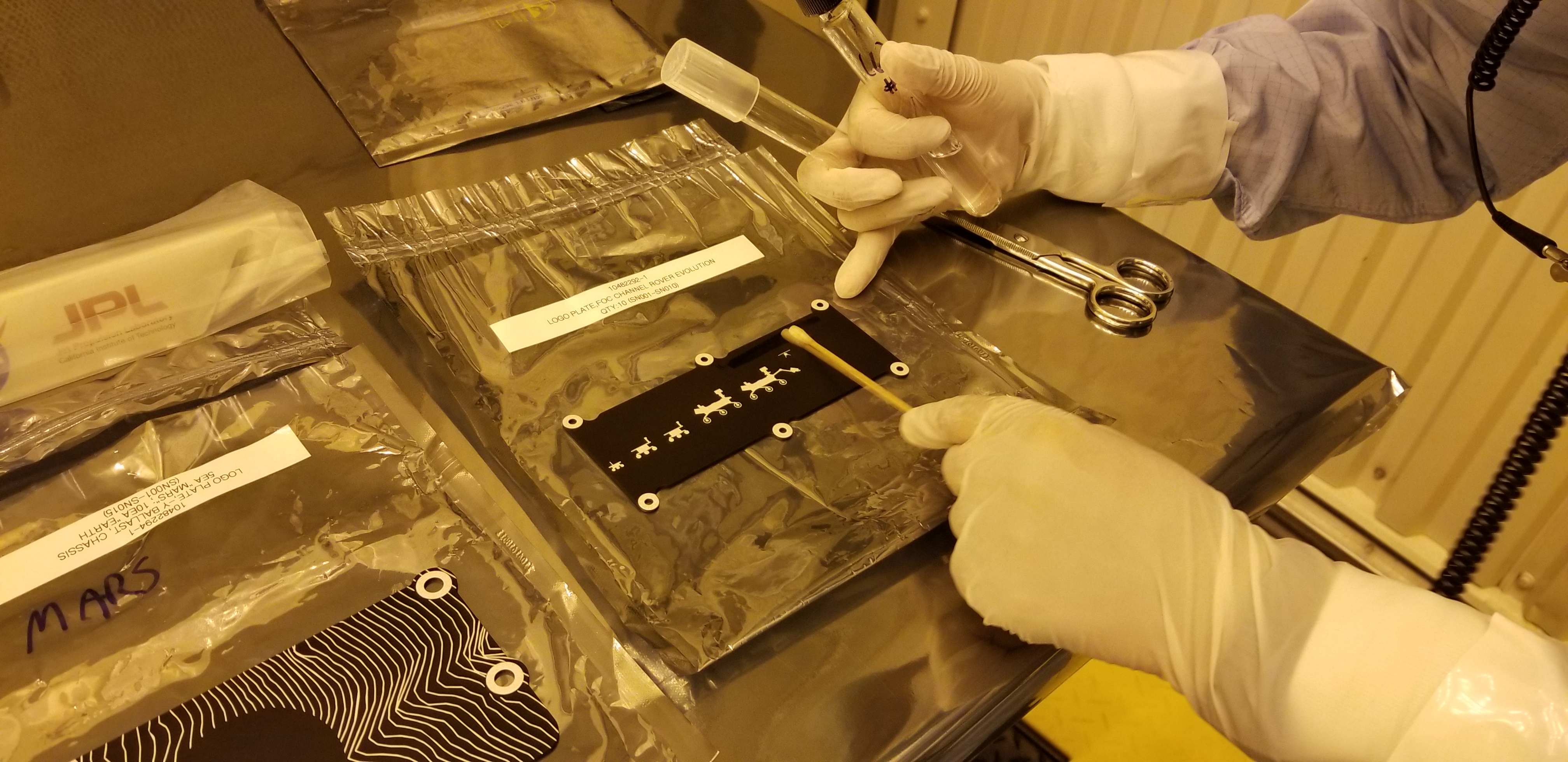 The photo was taken on March 16, 2020 in a cleanroom at NASA’s Kennedy Space Center during final preparation for launch. A planetary protection engineer is swabbing and cleaning the surface. This plate features illustrations of all the rovers (and the Mars Helicopter) that have landed on Mars.