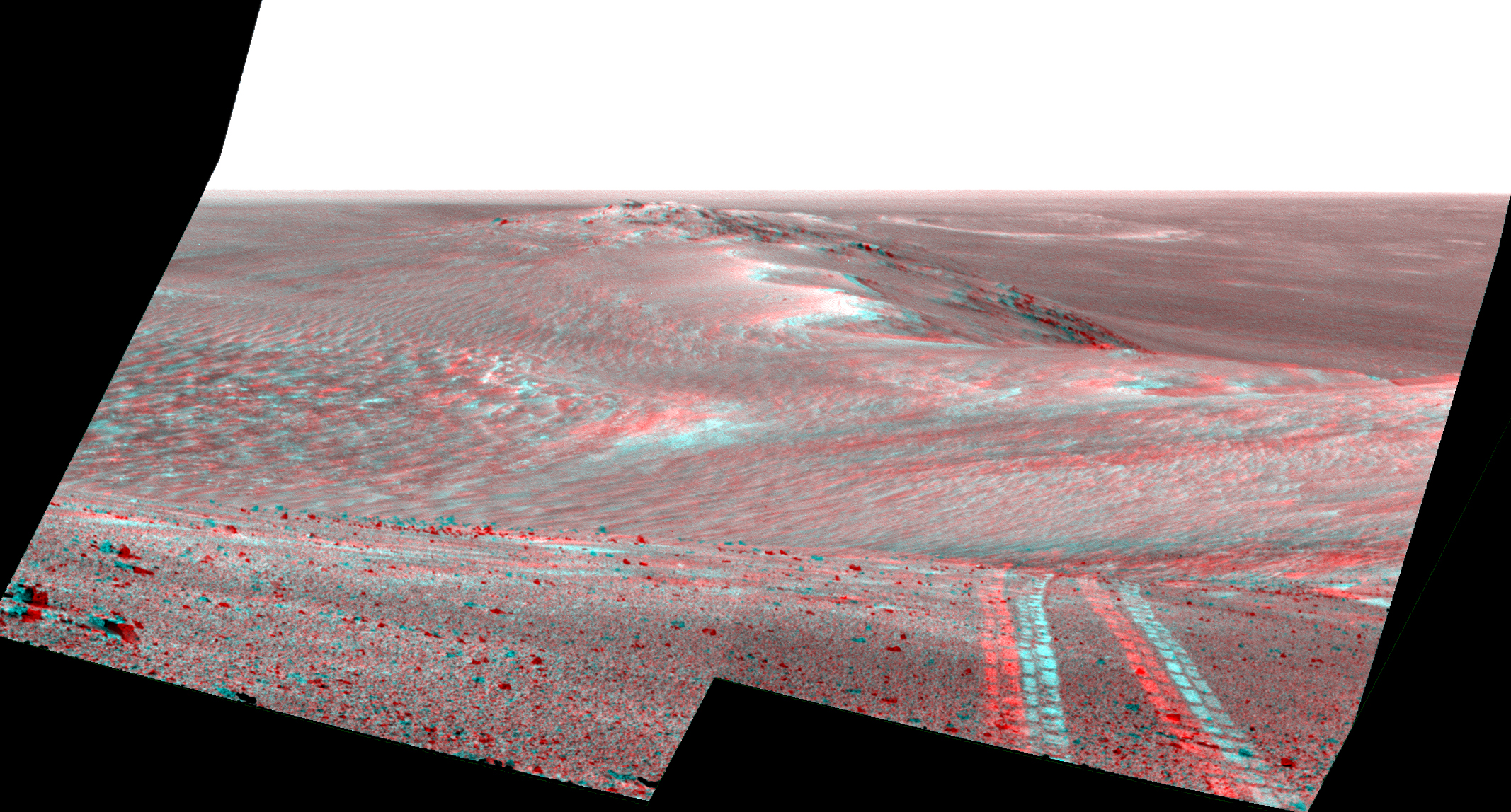 Rover’s Tracks in Stereo View Along Rim of Endeavour Crater