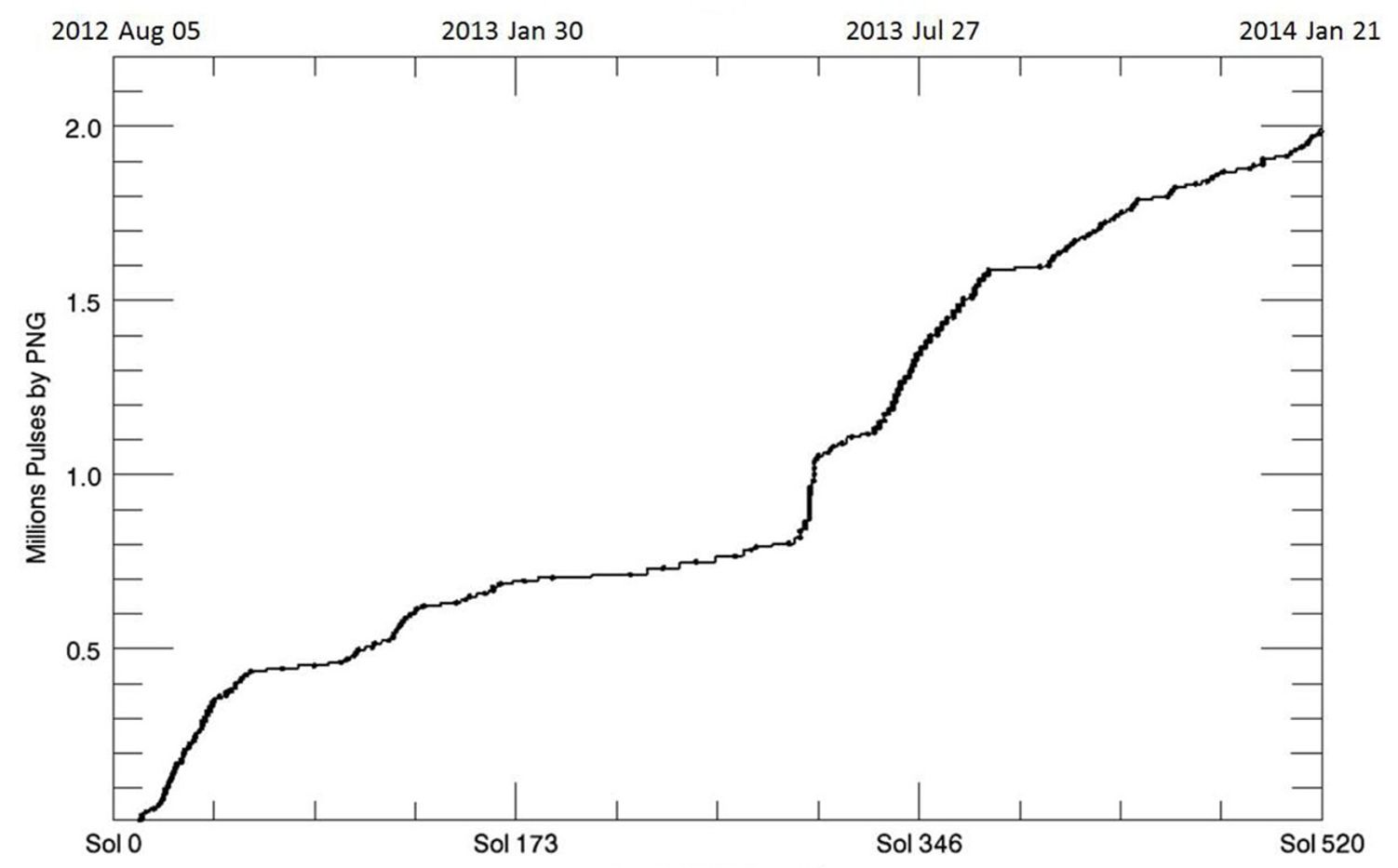 The Russian-made instrument on NASA's Mars rover Curiosity for detecting water that is adsorbed into soil or bound into shallow underground minerals has fired its 2 millionth pulse of energetic neutrons into the ground. It reached this milestone in late January 2014, not quite 18 months after the rover's landing on Mars in early August 2012.