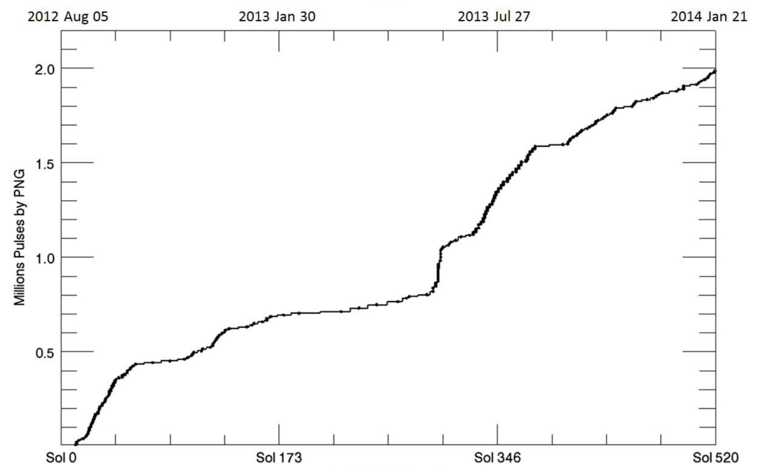This graph shows the cumulative total of pulses from DAN's pulsing neutron generator (PNG) rising to the 2 million level (vertical axis) as time progressed from the start of the mission. The top horizontal axis is labeled by Earth dates; the bottom one by the number of sols (Martian days) into the mission.