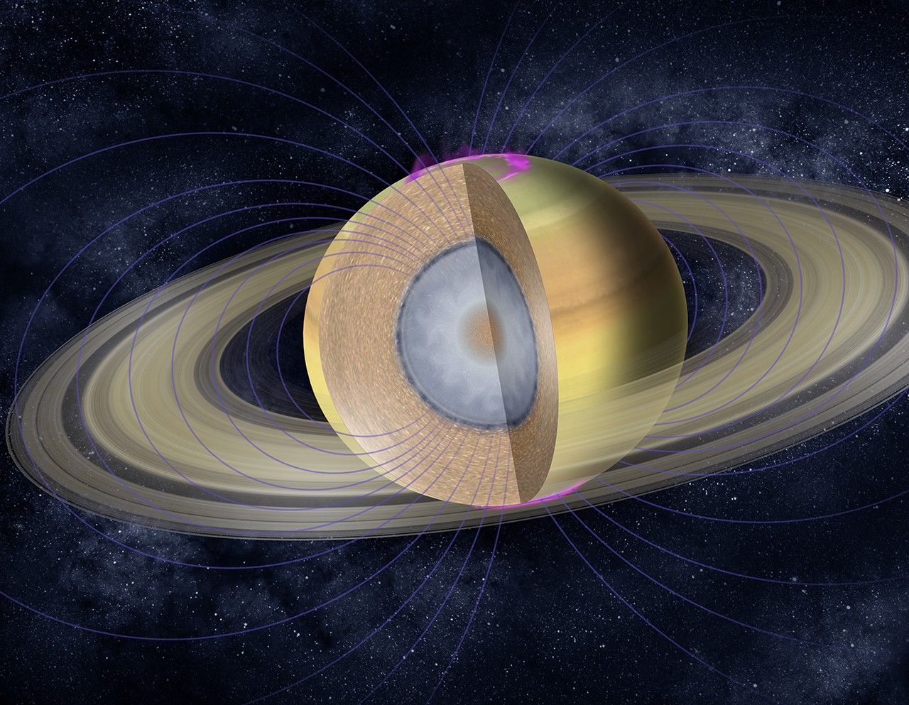This illustration shows the interior of Saturn, including its core of heavy elements (orange), liquid metallic hydrogen layer (grey), and gaseous molecular hydrogen envelope (brown). The planet's magnetic field is thought to originate from the top of the metallic hydrogen layer.