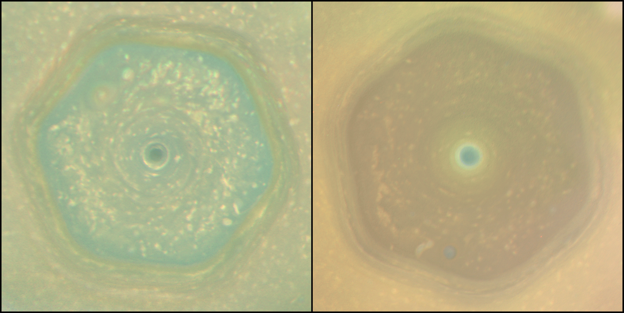 In both views, Saturn's polar hexagon dominates the scene. The comparison shows how clearly the color of the region changed in the interval between the two views, which represents the latter half of Saturn's northern hemisphere spring.