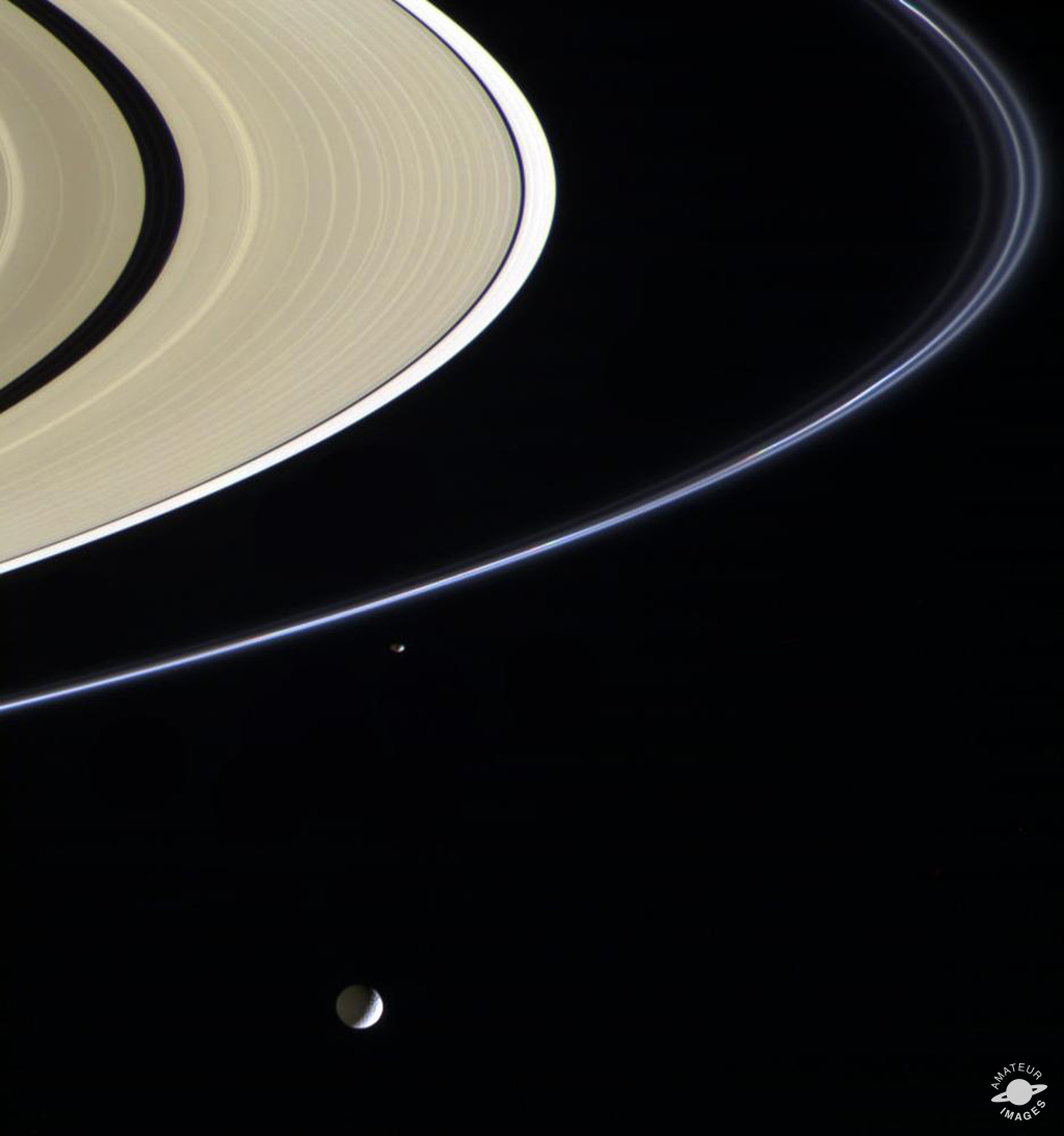 “In view here are Saturn’s inner rings and the moon Mimas (bottom). Also visible is Saturn’s thin F ring.