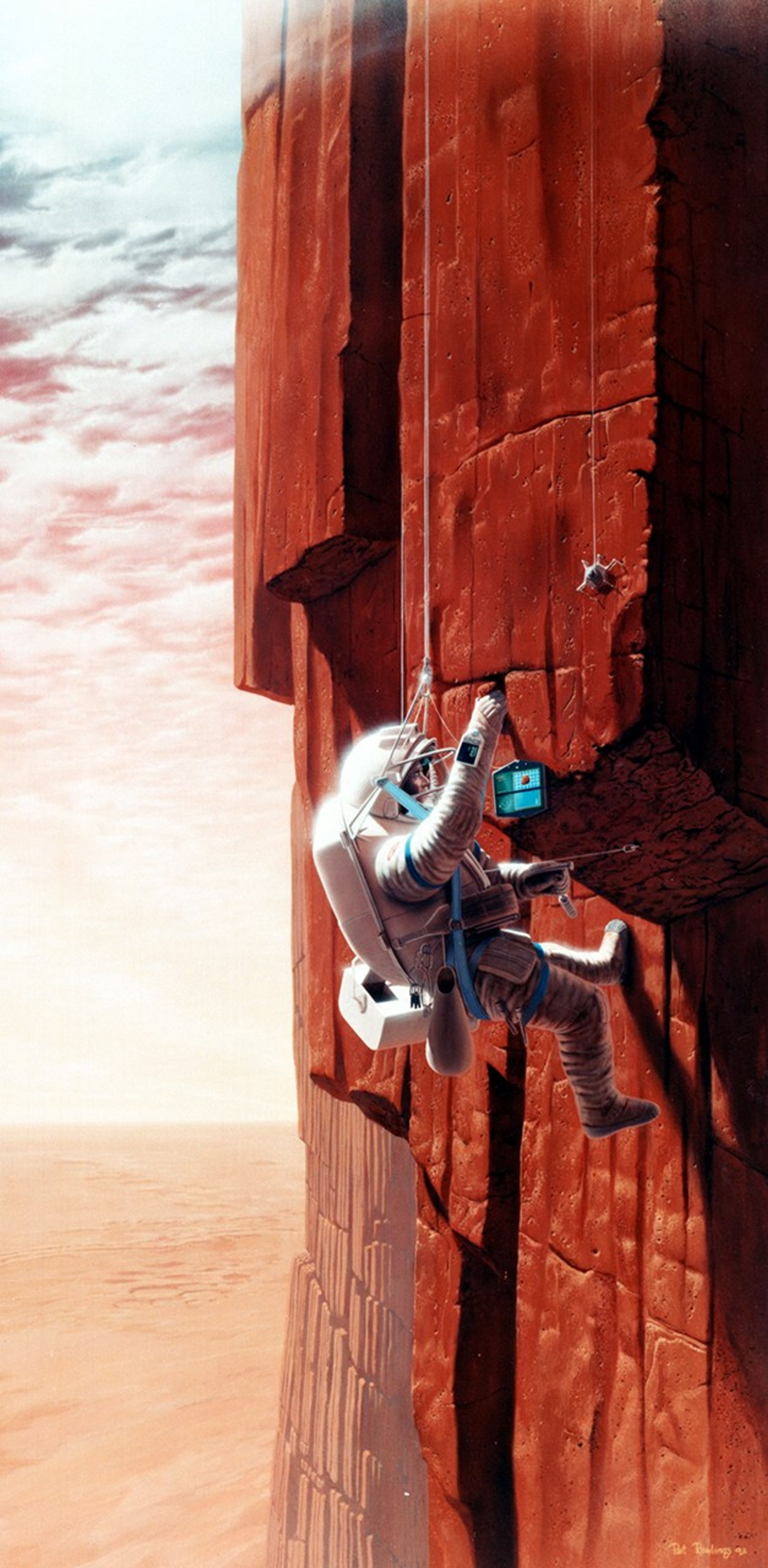 Artist's concept of possible exploration programs. Two kilometers above the lava flows of Mars' Tharsis Bulge region, a geologist collects samples from the eastern cliff at the base of Olympus Mons, the solar system's largest known shield volcano. To understand beter the evolution of the Arizona-sized volcano, the scientist investigates the layers of hardened lava that make up the massive feature. The block-like nature of the rock face, caused by columnar jointing, is similar to features on Earth, such as the Devil's Tower in Wyoming.