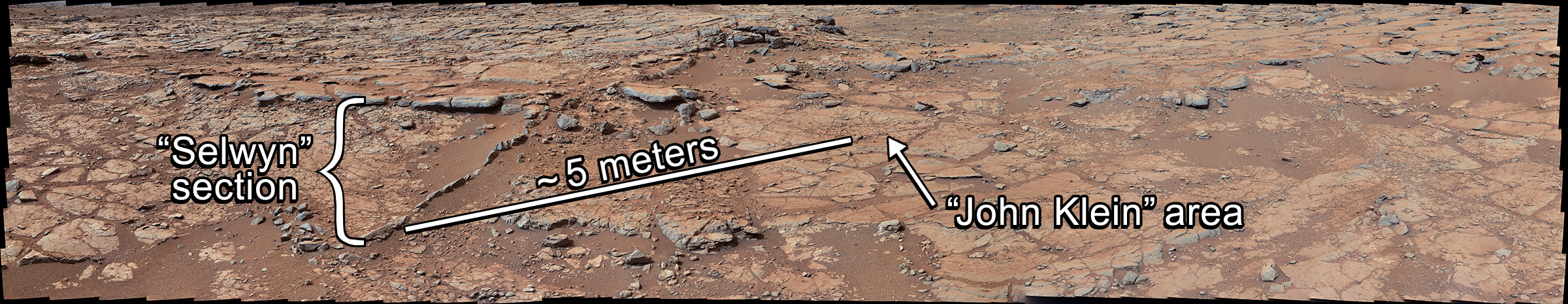Shown in this panorama are the locations of the "Selwyn" section, the "John Klein" drill area, and the approximate distance between them. The Curiosity science team completed an extensive investigation of the chemical and textural properties of the rocks at these locations in advance of drilling at John Klein. This investigation included 25 analyses from the Alpha Particle X-ray Spectrometer (APXS), more than 1,000 images from the Mars Hand Lens Imager (MAHLI), and more than 12,000 laser shots from the Chemistry and Camera instrument (ChemCam).