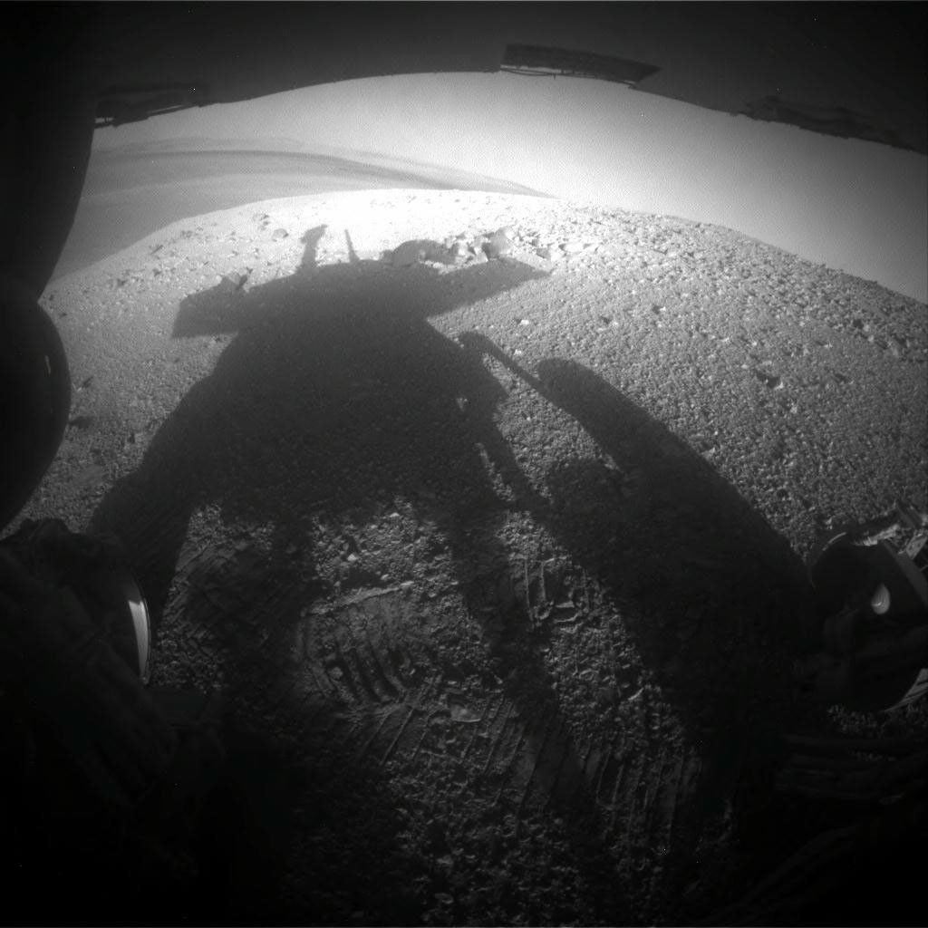 NASA's Mars Exploration Rover Opportunity caught its own silhouette in this late-afternoon image taken by the rover's rear hazard avoidance camera. This camera is mounted low on the rover and has a wide-angle lens.