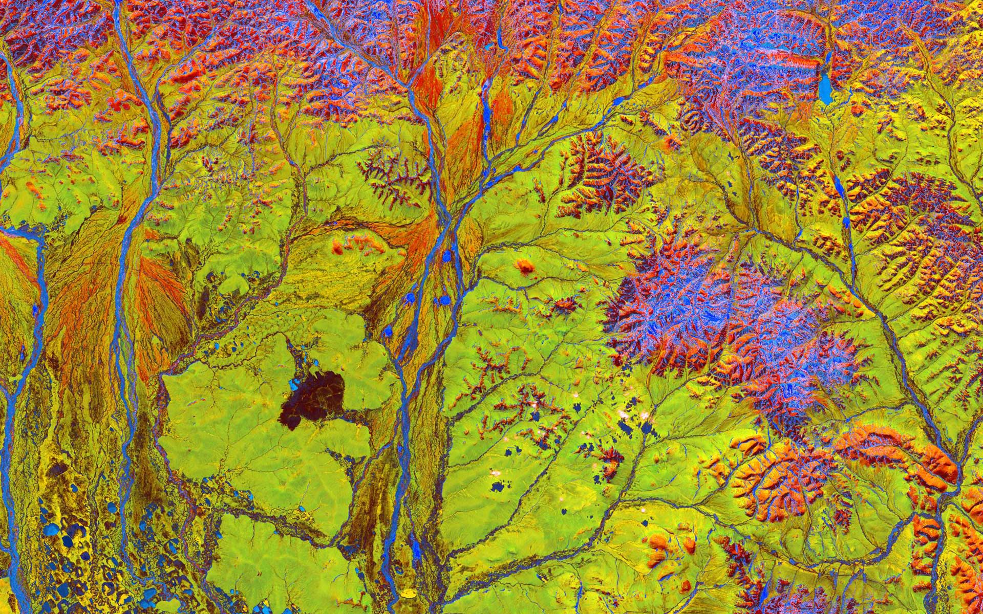 Vivid colors and bizarre shapes come together in this artistic, fantastical image, taken from space on June 15, 2005. The labyrinth of exotic features was spotted along the edge of Russia's Chaunskaya Bay (shown by the vivid blue half circle) in northeastern Siberia. Two major rivers, the Chaun and Palyavaam, flow into the bay, which in turn opens into the Arctic Ocean. Ribbon lakes and bogs are present throughout the area, created by depressions left by receding glaciers.