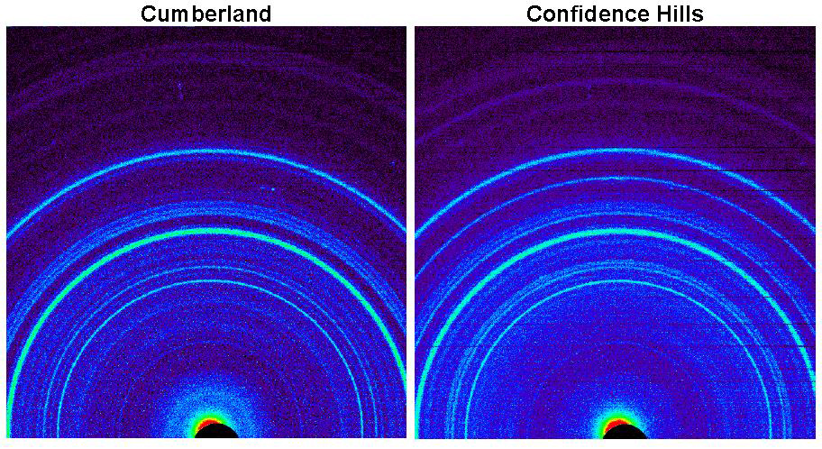 This side-by-side comparison shows the X-ray diffraction patterns of two different samples collected from rocks on Mars by NASA's Curiosity rover. The images present data obtained by Curiosity's Chemistry and Mineralogy instrument (CheMin).