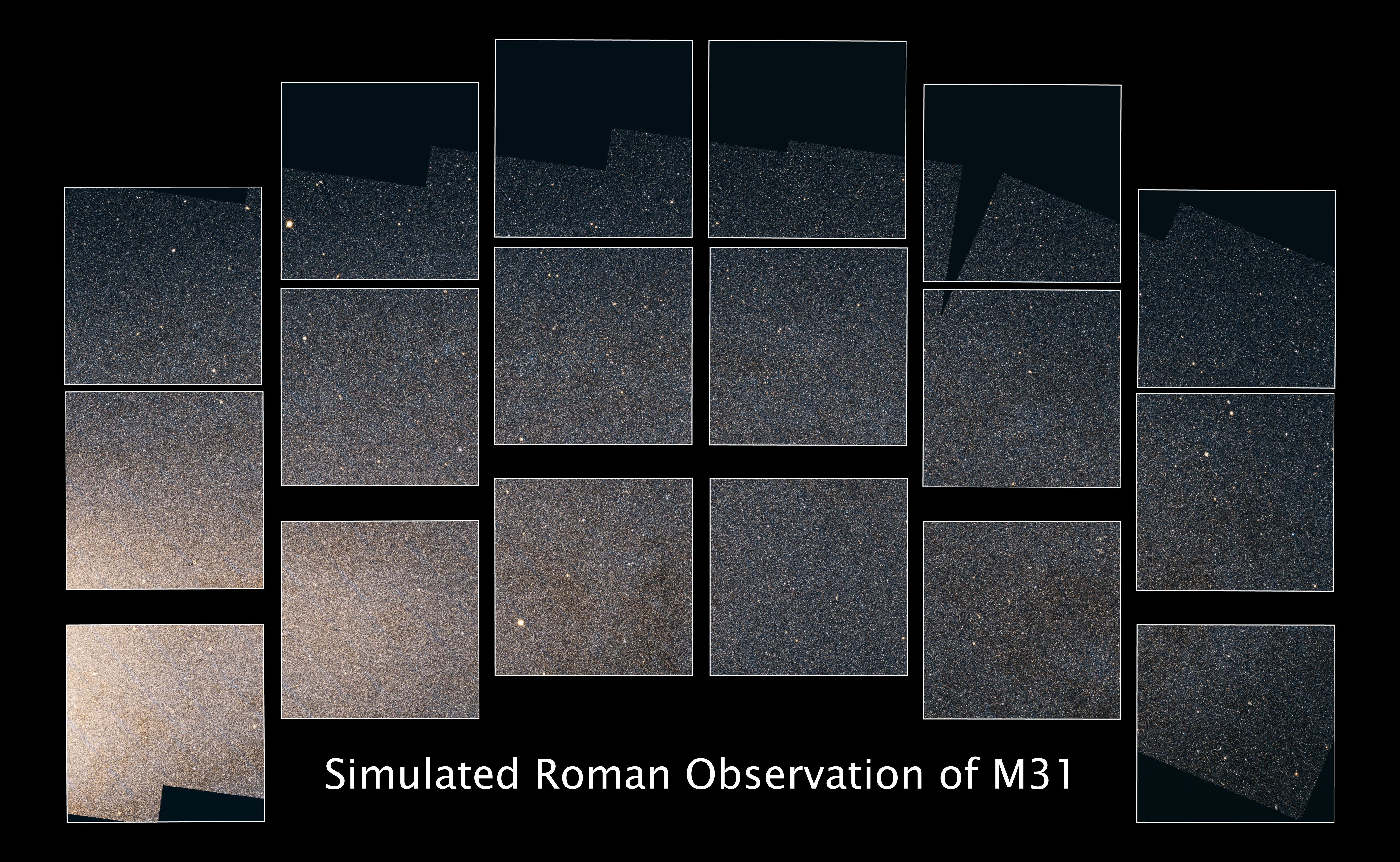 This image shows the detector “footprint” of NASA's Nancy Grace Roman Space Telescope. Six columns of three squares are arranged such that the top of the middle two columns are close to the top of the image, the next two columns are a little lower down, and the two outer columns are even lower. Within these square are seen a simulated image that has a background of pale black dotted with stars. The squares on the lower left side have brighter light, which would represent regions of the sky closer to the center of the Andromeda galaxy.