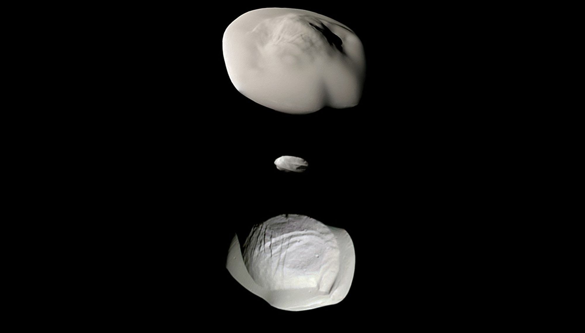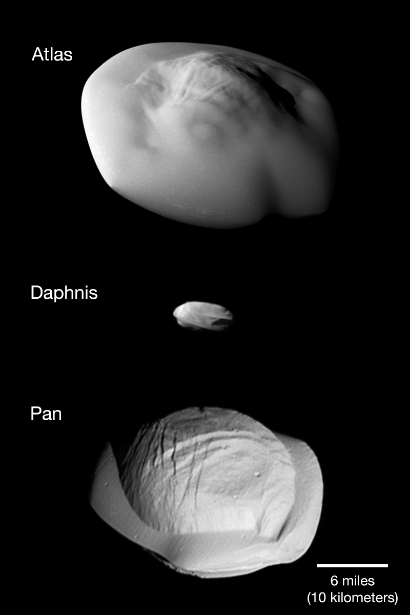 This montage of views from NASA's Cassini spacecraft shows three of Saturn's small ring moons: Atlas, Daphnis and Pan at the same scale for ease of comparison.